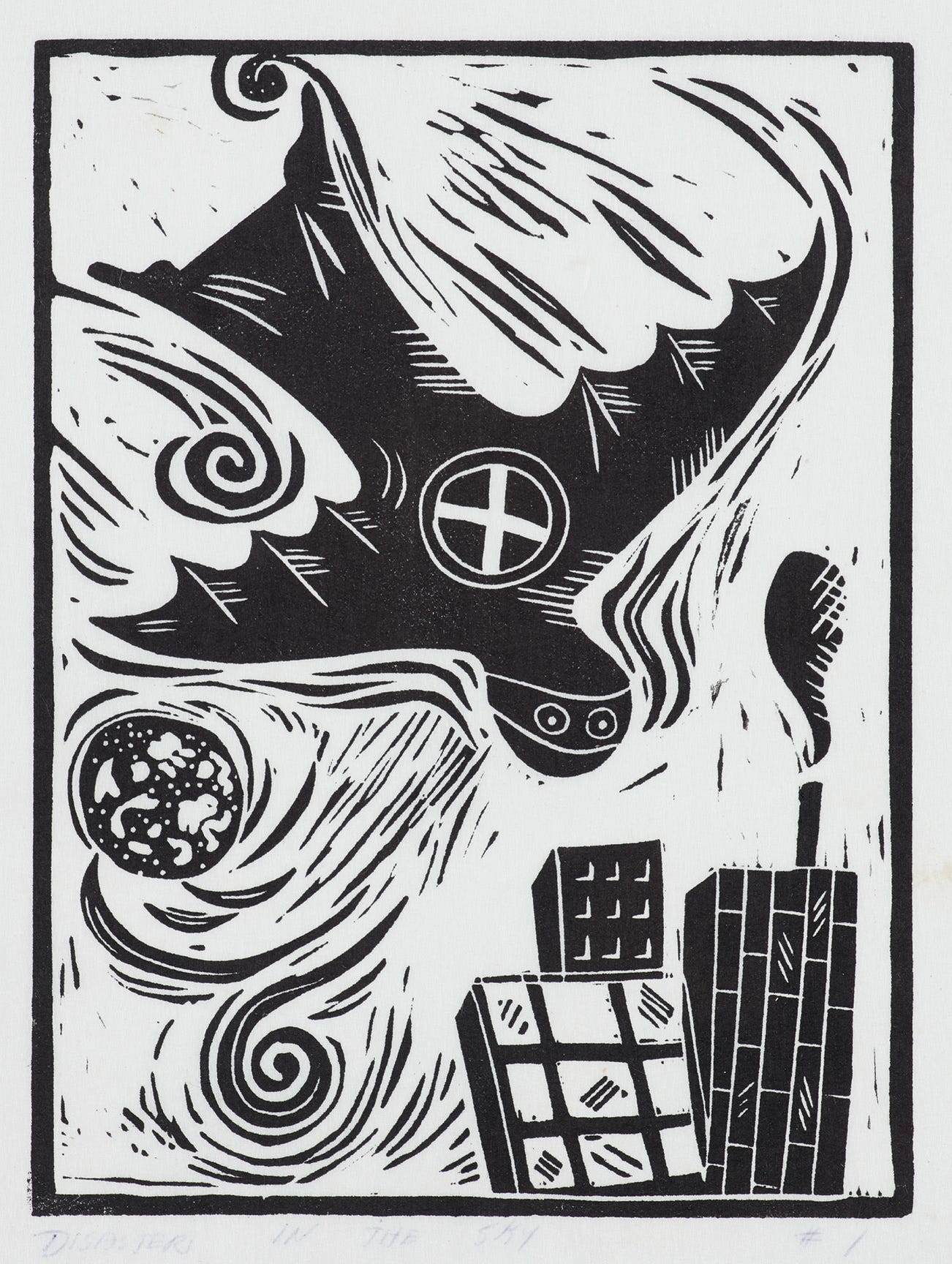 Linocut in black, on thin Japan paper, with margins.