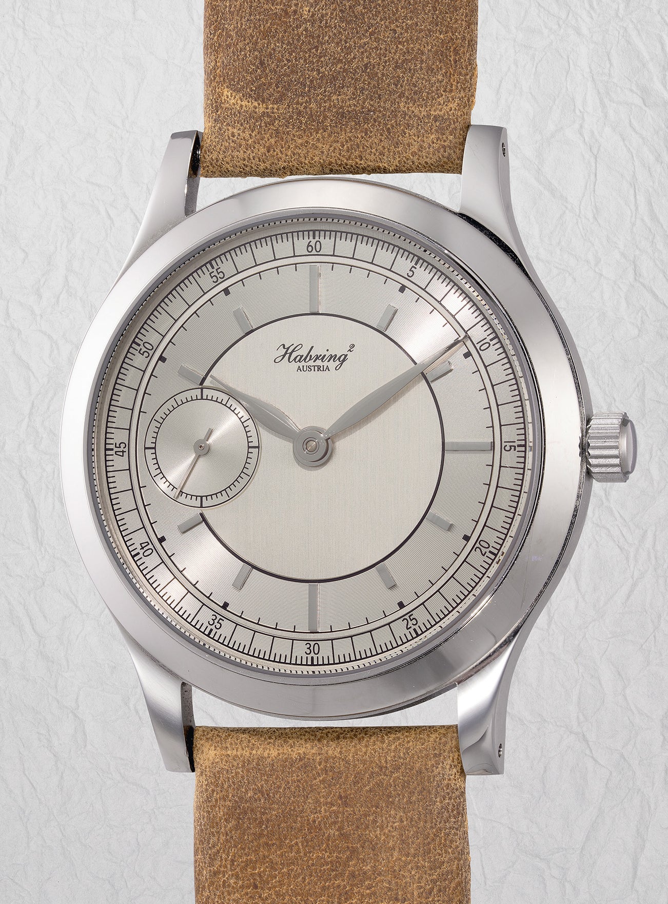 Founded in 2004 by Maria and Richard Habring, this independent Austrian watchmaking atelier has quickly emerged as a powerhouse in exceptional design within the world of horology. Entirely assembled in Austria, the Felix model draws inspiration from 1940s timepieces, featuring a hand-brushed stainless steel case. The unique champagne-like dial, adorned with a two-tone finish, adds depth and creates a captivating contrast with the case. The vintage-style sector dial and precision railroad tracks contribute to the overall balance and appeal of the design.