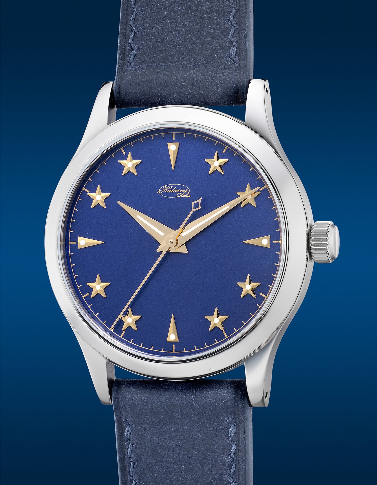 A passion project between SJX and Habring2 paying tribute to the horological greats of the 1950s, the Erwin Star most notably pays hommage to the Rolex reference 6088 "Galaxy". Designed with recognisable details with a contemporary twist, its rich blue dial contrast beautifully against the applied gold star-set numerals. Made of gilded brass, each star hour marker is stamped, diamond cut and finally gently polished, giving them a reflective facetted surface. Housed under the dial is the calibre A11s developed by Harbring2 based from the Valjoux 7750. Beautifully finished with large perlages and decorated with blued steel screws, the movement features a dead beat seconds complication. Cased in a 38.5mm stainless steel and preserved in excellent condition accompanied by all its original accessories, the present Erwin Star is numbered 36 from its edition of 50 pieces.