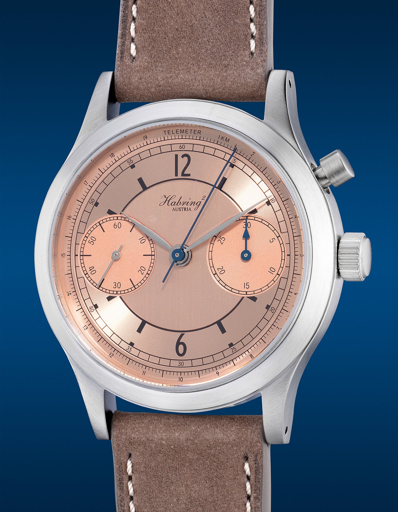 A rare and “like-new” limited edition mono-pusher chronograph with two-tone salmon dial, telemeter scale, certificate and presentation box, numbered 17 of a limited edition of 33 pieces, made in collaboration with Monochrome