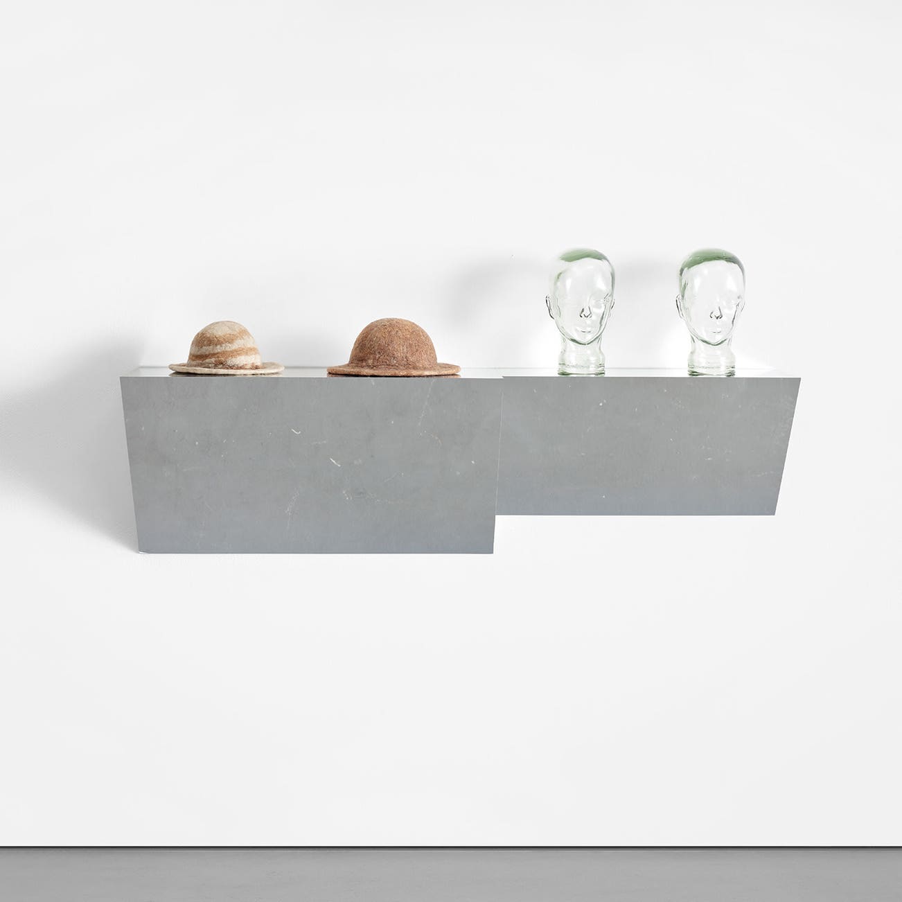 chrome laminated wood shelf, 2 felt hats and 2 glass heads
