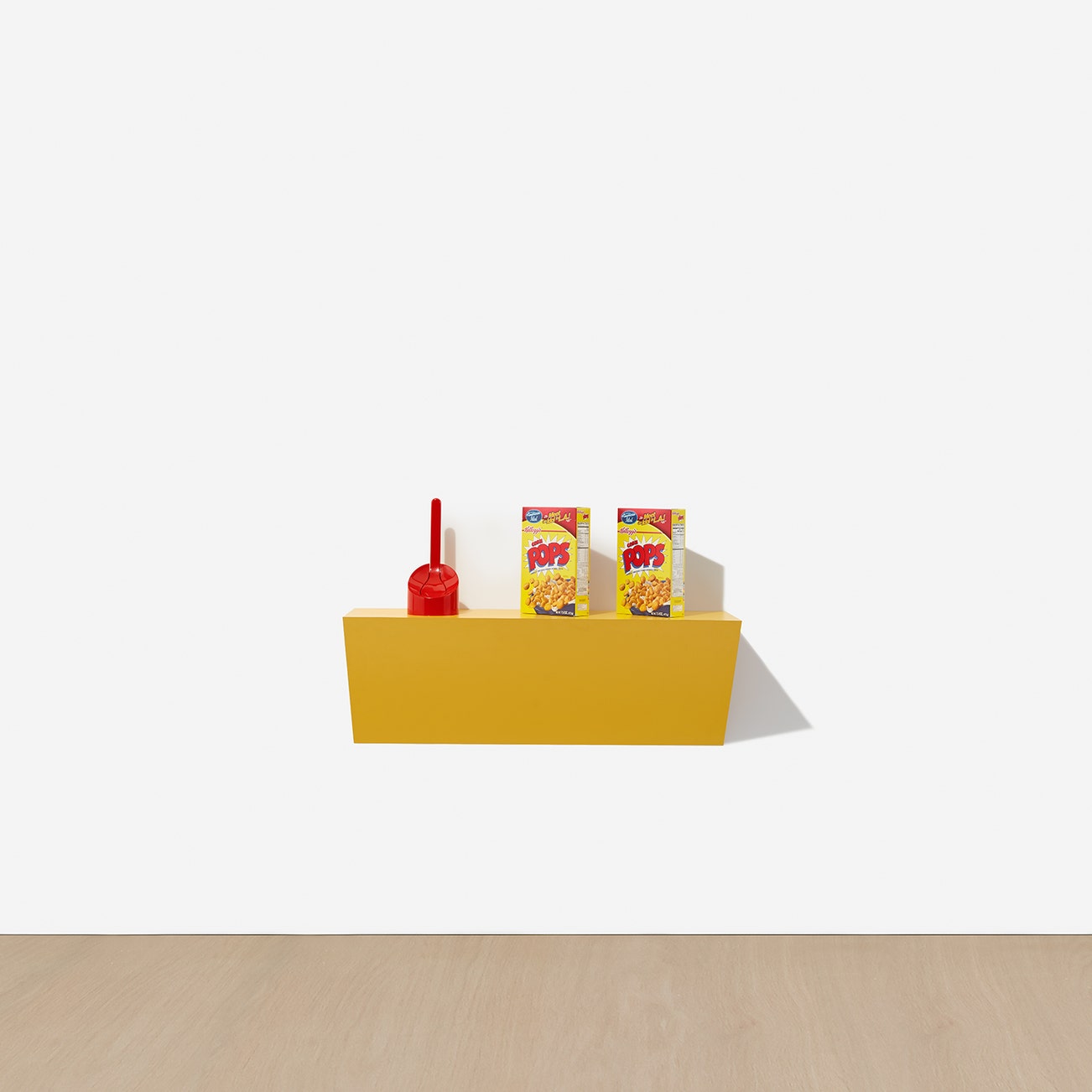plastic laminated wood shelf, one plastic toilet brush and two Pops cereal boxes
