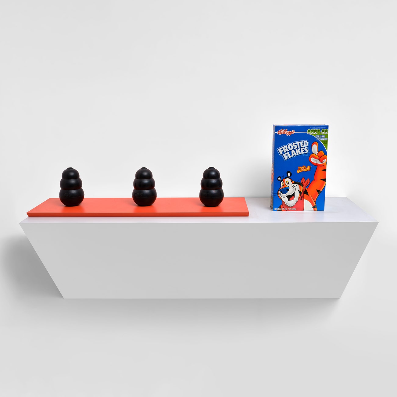 plastic laminated wood shelf, frosted flakes cereal box and three rubber dog chews