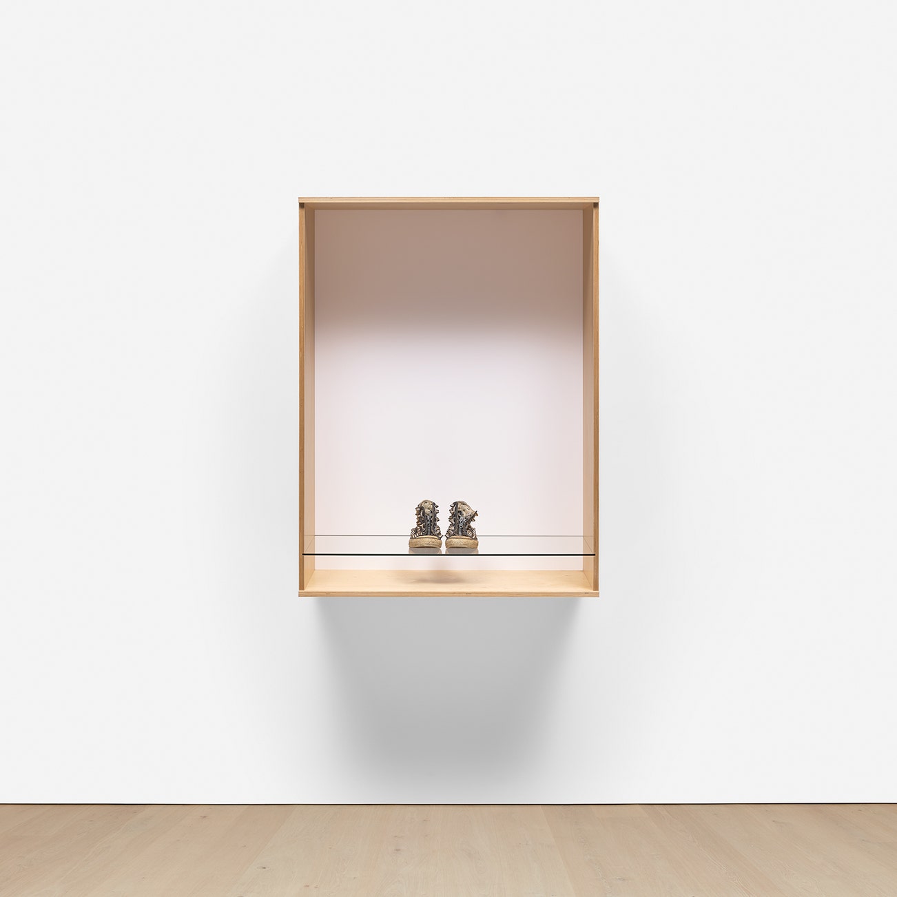 Baltic birch plywood, plastic laminate and glass box and canvas, rubber and metal 'Dirty Black Sneakers' by Douglas Abraham