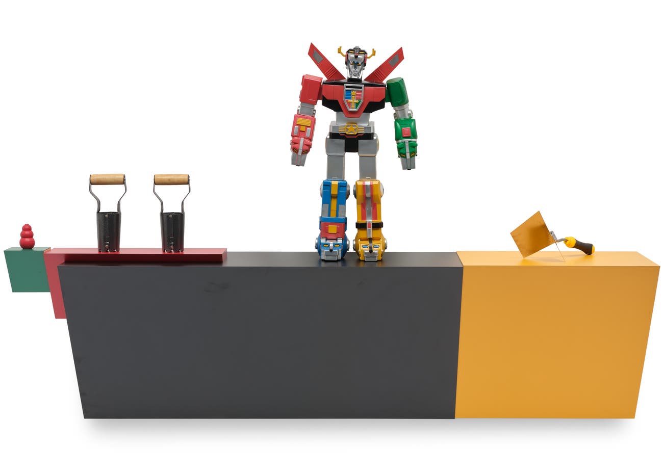 plastic laminated wood shelf, dog chew, two bulb planters, "Beast King GoLion" toy and outside corner trowel