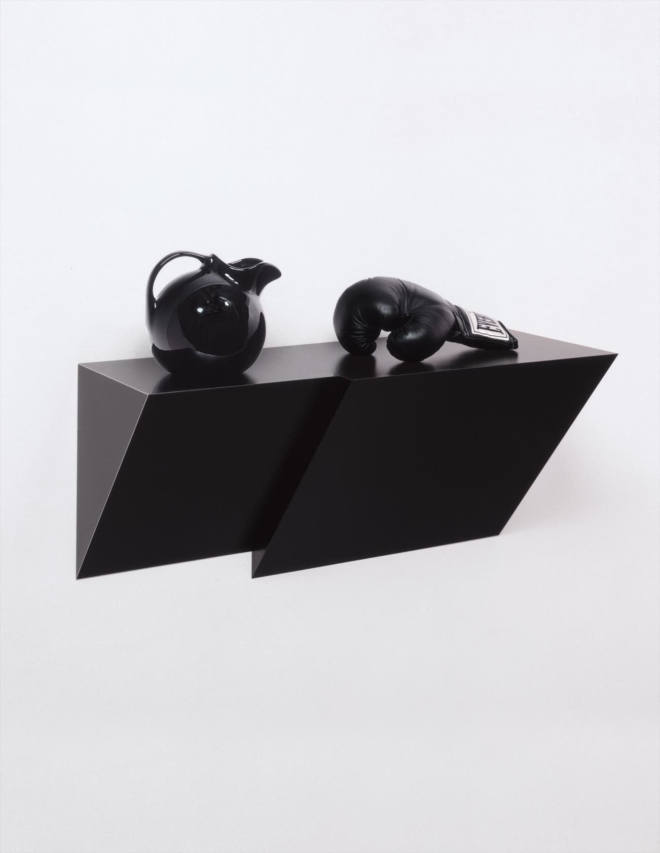 plastic laminated wood shelf, ceramic pitcher, leather boxing glove