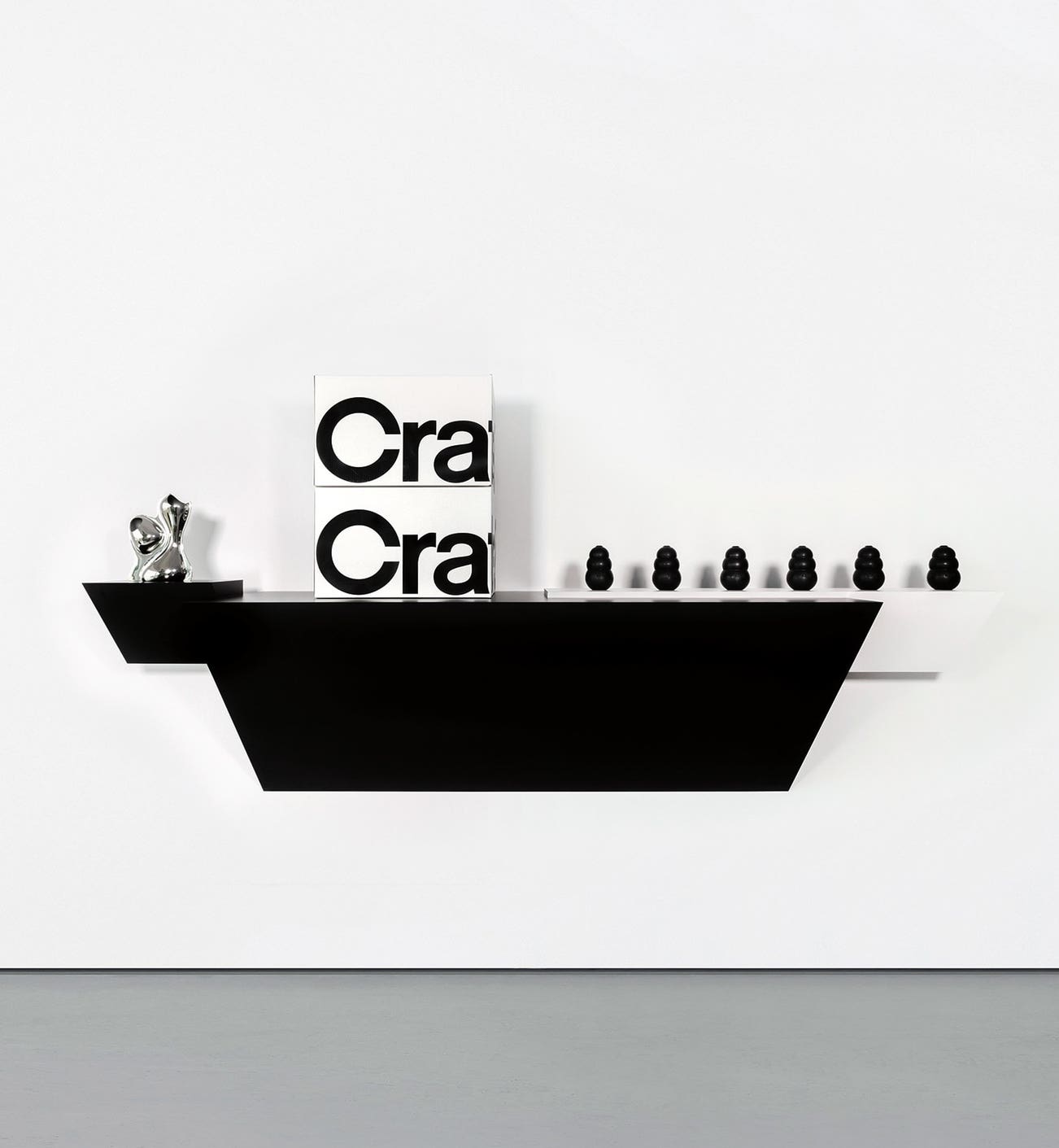 plastic laminated wood shelf, 6 rubber dog chews, 2 'Crate & Barrel' cardboard boxes and stainless steel vase by Ron Arad