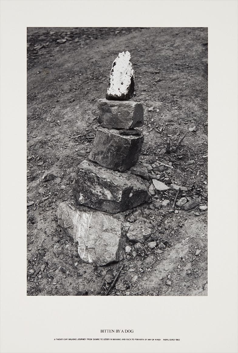 Hamish Fulton's dedication to the journey of his many walks has sculpted a body of work that uses iconography, color, drawings, photographs, and text to document these voyages. Fulton began his walks, varying in duration and taking place all over the world, in the late 1960s where he documented his interaction and experience on each trip. Landmarks are depicted with specific colors and line drawings and photographs with accompanied captions offer site specific information from the journey. Bitten by a Dog: A Twenty Day Walking Journey from Dumre to Leder and back to Pakhara by way of Khudi, Nepal, early 1983 stems from a walk in the Annapurna region in the Himalayas which he called Twilight Horizons. This walk later became a book with text, photos, and drawings of which this image was included.
