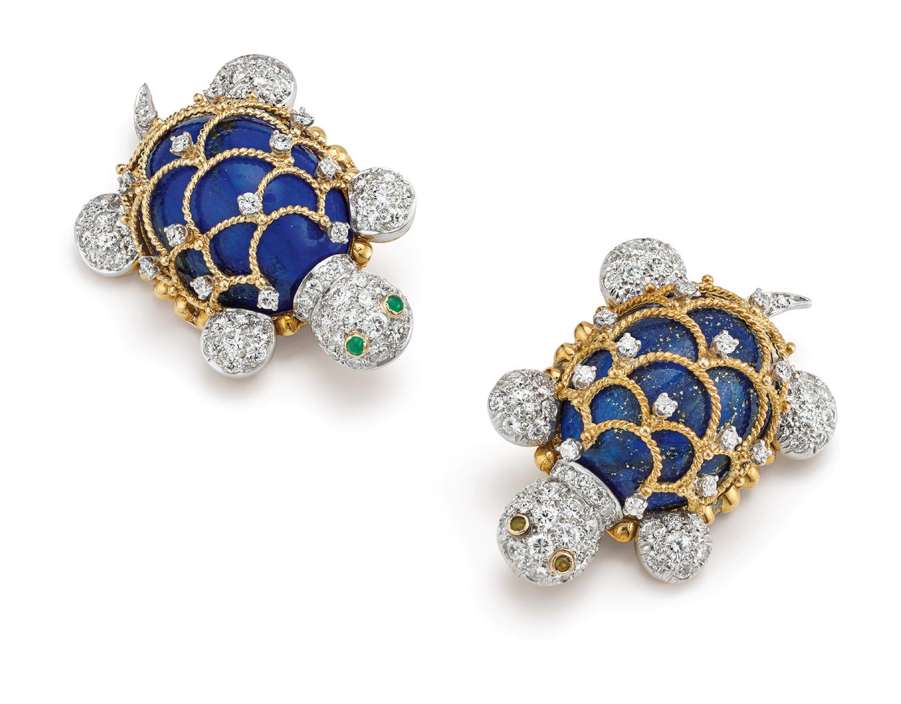 A Pair of Lapis Lazuli, Diamond, Emerald, Peridot, Platinum and Gold Brooches