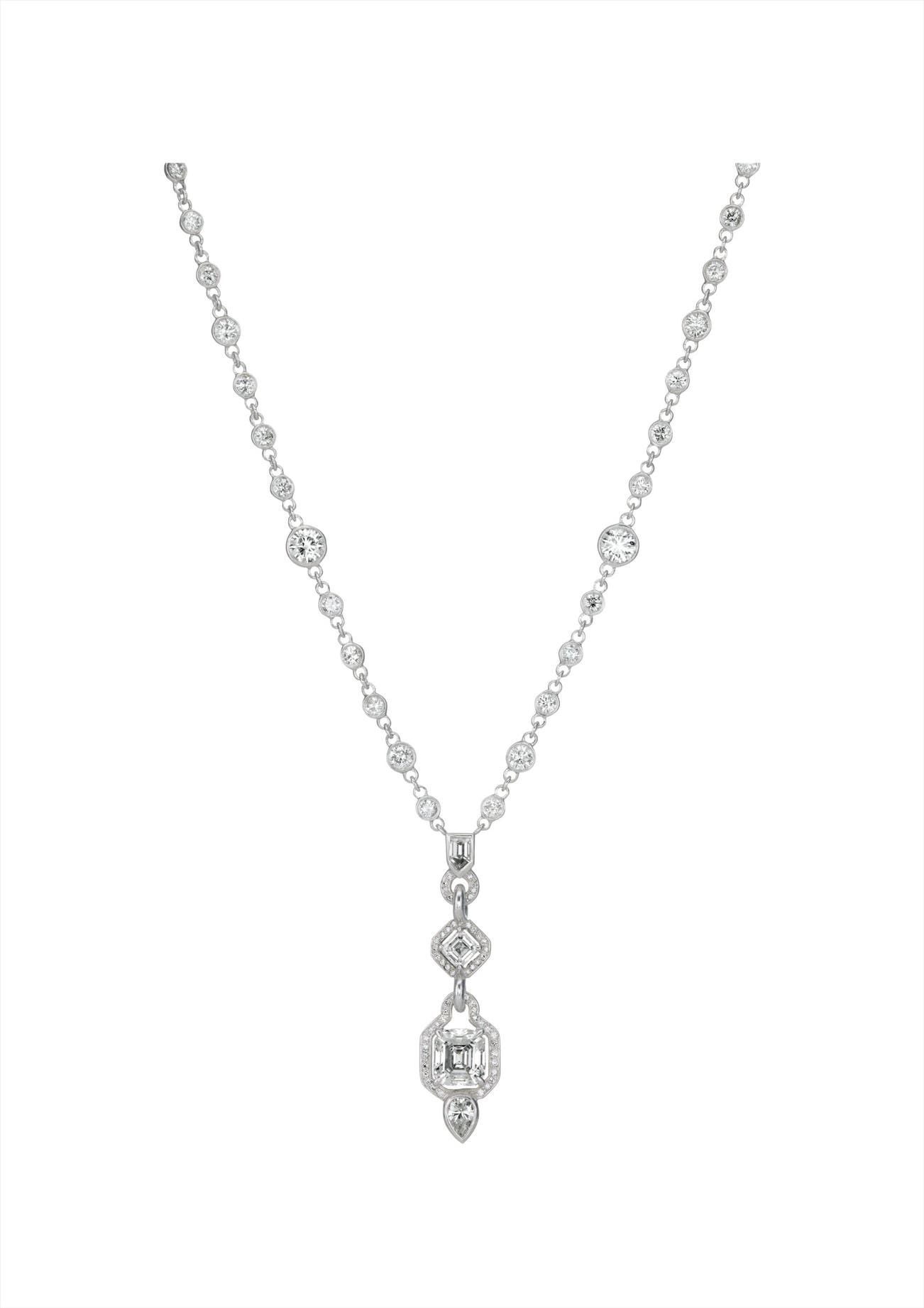 Set to the front with a square-cut diamond drop within a pavé-set diamond surround, enhanced by a pear-shape diamond, to the similarly designed spacer links and spectacle-set diamond back chain, mounted in platinum, chain length 17 inches, pendant length 1 1/2 inches.
