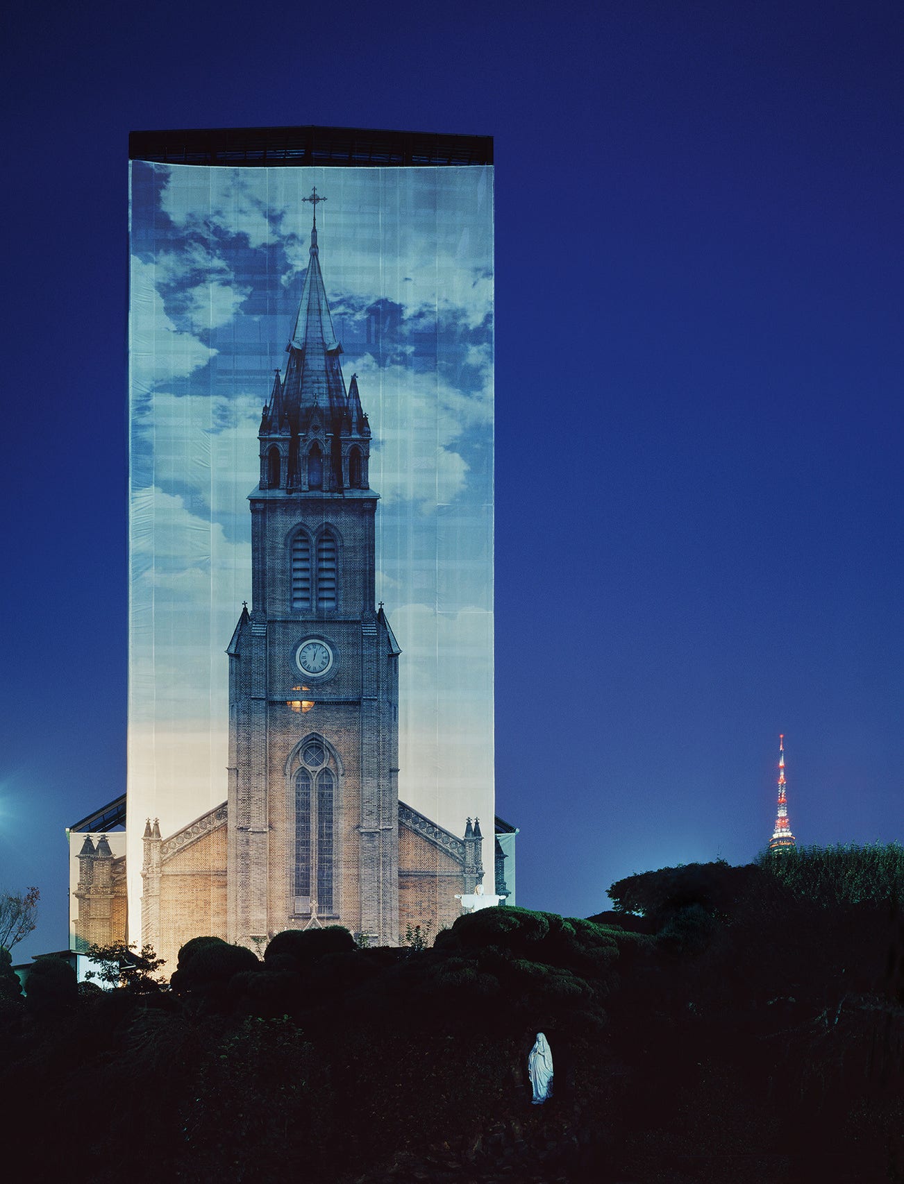 Around twilight, when the sun is below the horizon, the sky can turn a midnight blue, as seen in the present work by Seoul-based artist Han Sungpil. Since 2004, Han has chosen this time of day known as the blue hour to photograph the life-size printed screens that are erected to conceal buildings undergoing restoration, drawing our attention to these visual illusions and how an image of the building can stand in for the building itself. The Dominion of Light, offered here, showcasing a 1:1 facsimile of the 45-metre-high steeple of the Myeongdong Cathedral – a symbol of the Korean Catholic Church and an instantly recognisable feature of the Seoul cityscape – has become the most desired image from his Facade series. His work has been exhibited internationally in numerous museums, including the Museum of Fine Arts, Houston; Tokyo Photographic Art Museum; and National Museum of Modern and Contemporary Art, Korea.
