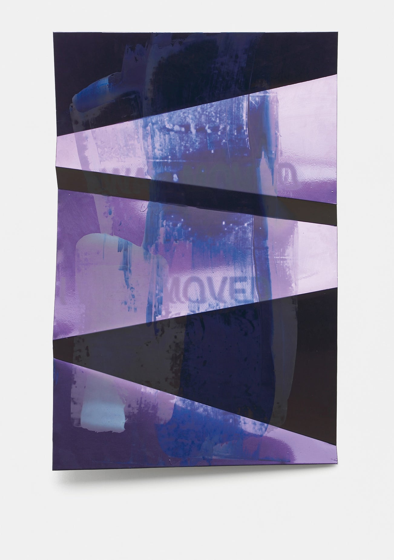 Hannah Perry is well known for her video artworks, which are created by processing personal videos from her iPhone through a VHS player or data compression in order to compromise the image quality. Her newer sculptures, including I was moved (on the bonnet) #2, are intimately connected with the videos, allowing her to explore similar subject matter in concrete form. The sculptures are made of aluminum and covered with screenprints and vinyl paint that is most frequently used to decorate racing cars. The aluminum is crunched, bringing to mind the hood of a car that has experienced a crash, covered in blue and purple paint that quietly drip around a single word: “move”. (Text by Paddles ON! curator Lindsay Howard