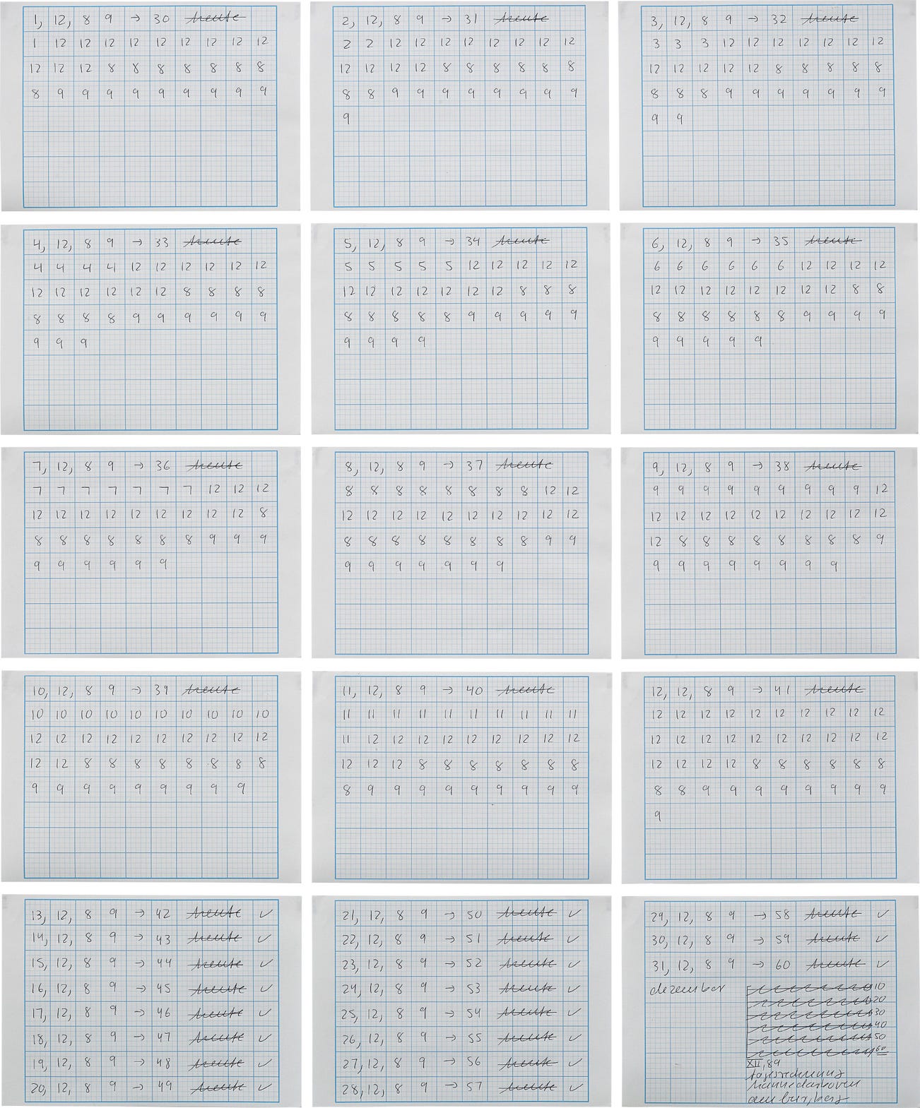signed, partially titled and dated 'XII,89 "Tagesrechnung" Hanne Darboven 1989' lower right