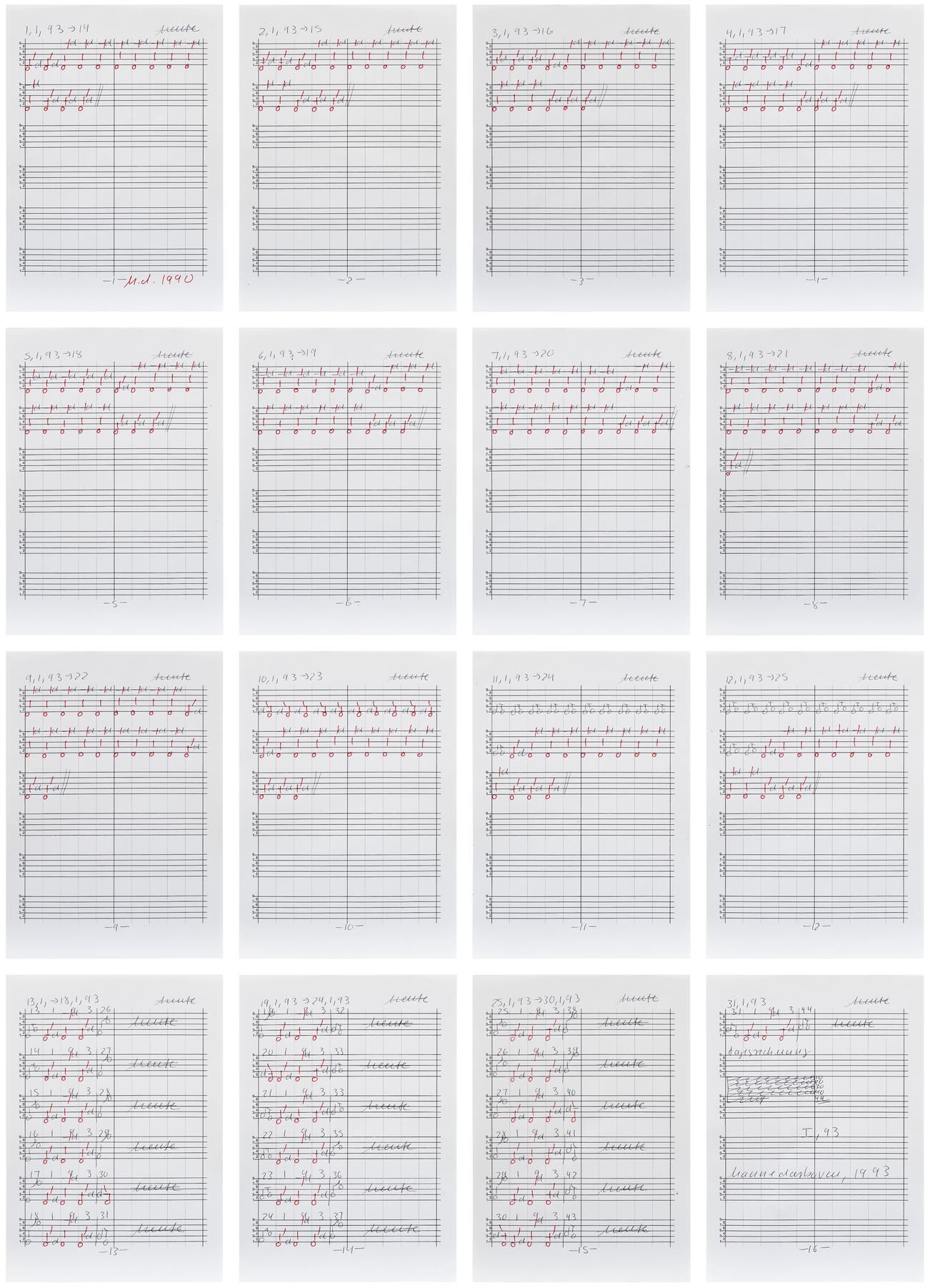 signed with the artist's initials 'H.d 1990' lower right of part 1; signed and dated 'Hanne Darboven, 1993' lower centre of part 16