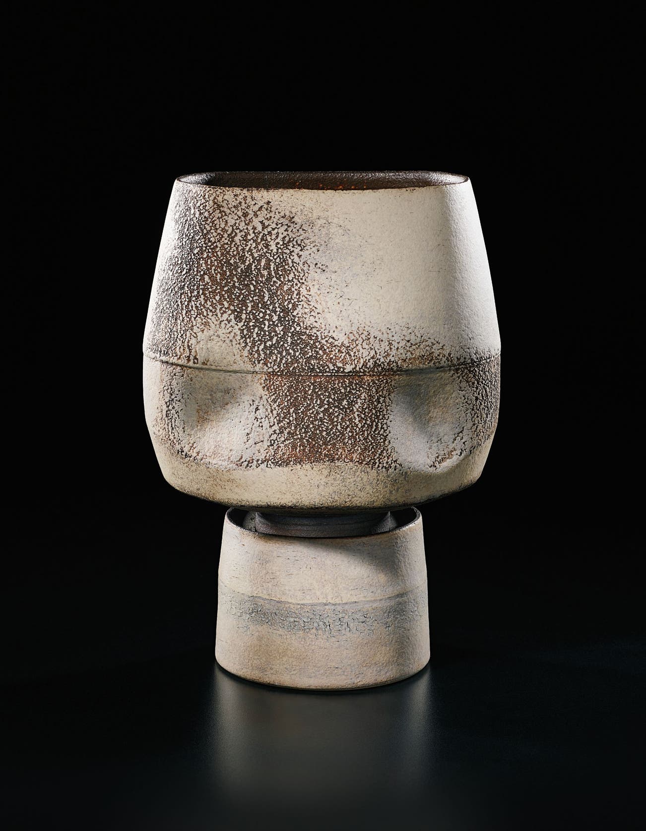 In the last phase of his career, Coper reduced the scale of his work creating small "Cycladic" pots that stood on pedestals or drums, recalling the clay figures of Bronze Age Greece.
