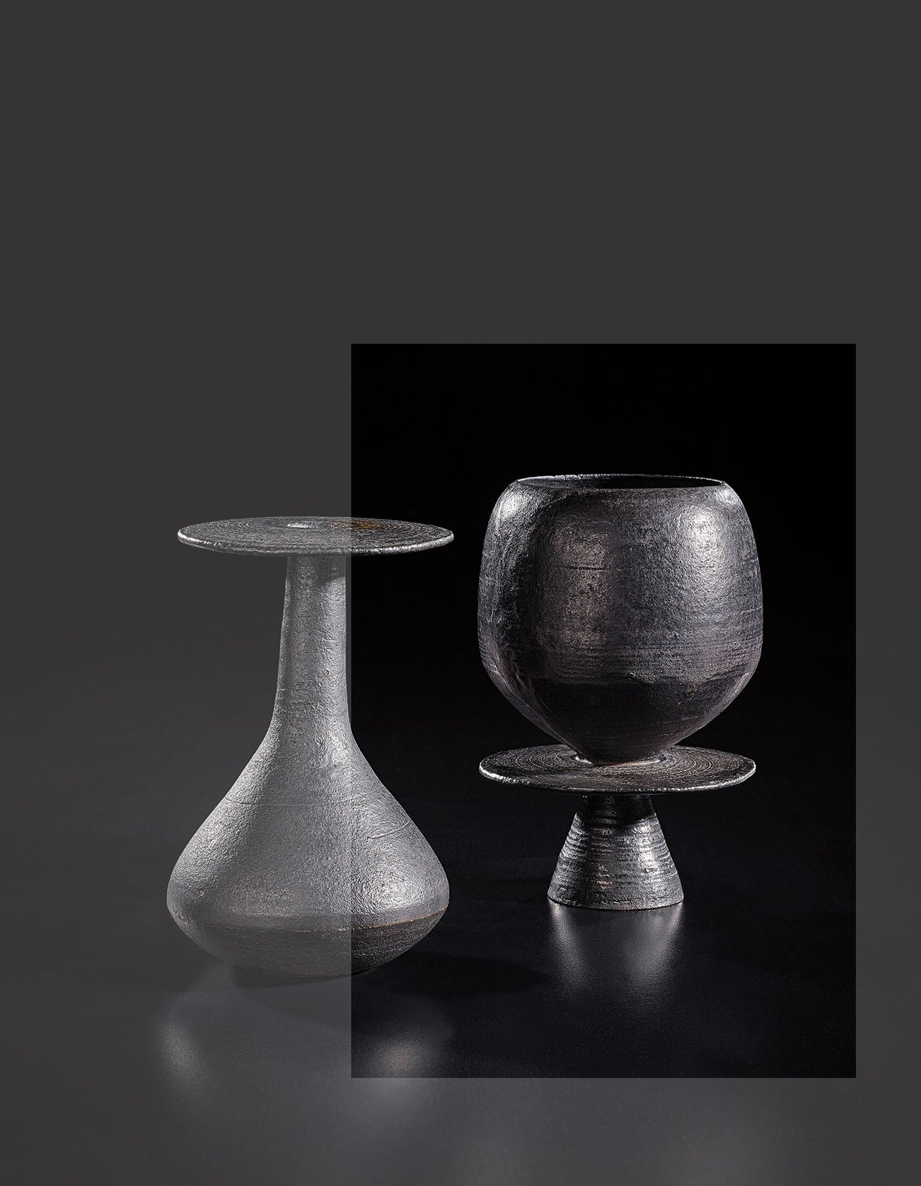 Coper favored compound shapes that, while simple in appearance, were in fact complex in construction. Similar to the making of Joseon Dynasty Moon Jars (Rie in fact displayed a Moon Jar in the studio), he would build his vessels by bringing several thrown forms together, for example joining bowls rim to rim. Coper eschewed glazes and preferred the textured surfaces achieved through the application of white and black slips, evoking the abraded texture of excavated vessels. This interest in ancient objects was very much in step with other modernists of his time—Coper admired Constantin Brancusi and Alberto Giacometti and his textured markings have been compared to sculptors such as William Turnbull.