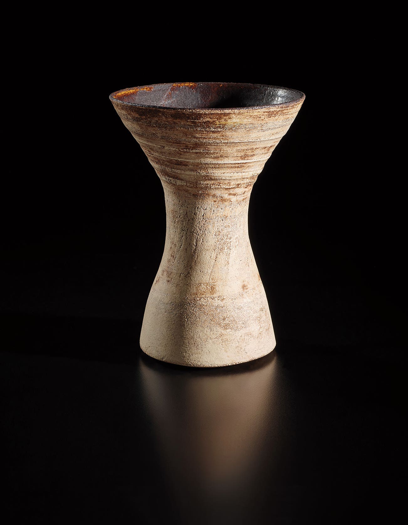In the last phase of his career, Coper reduced the scale of his work creating small "Cycladic" pots that stood on pedestals or drums, recalling the clay figures of Bronze Age Greece.