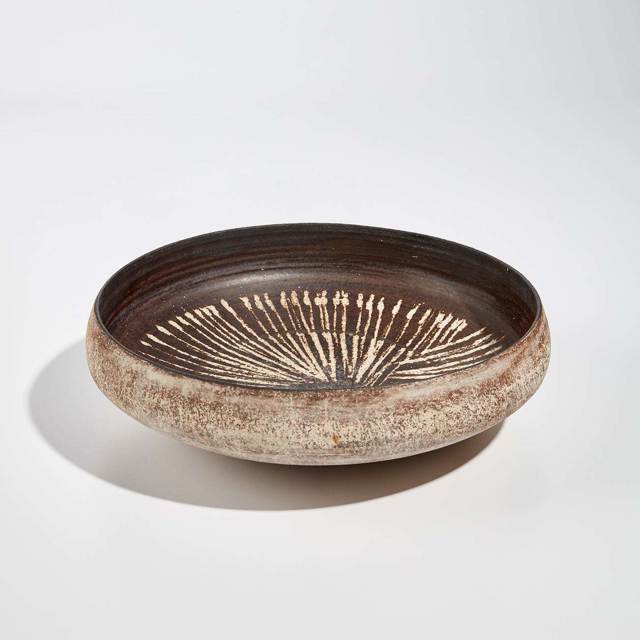 Coper favored compound shapes that, while simple in appearance, were in fact complex in construction. Similar to the making of Joseon Dynasty Moon Jars (Rie in fact displayed a Moon Jar in the studio), he would build his vessels by bringing several thrown forms together, for example joining bowls rim to rim. Coper eschewed glazes and preferred the textured surfaces achieved through the application of white and black slips, evoking the abraded texture of excavated vessels. This interest in ancient objects was very much in step with other modernists of his time—Coper admired Constantin Brancusi and Alberto Giacometti and his textured markings have been compared to sculptors such as William Turnbull.