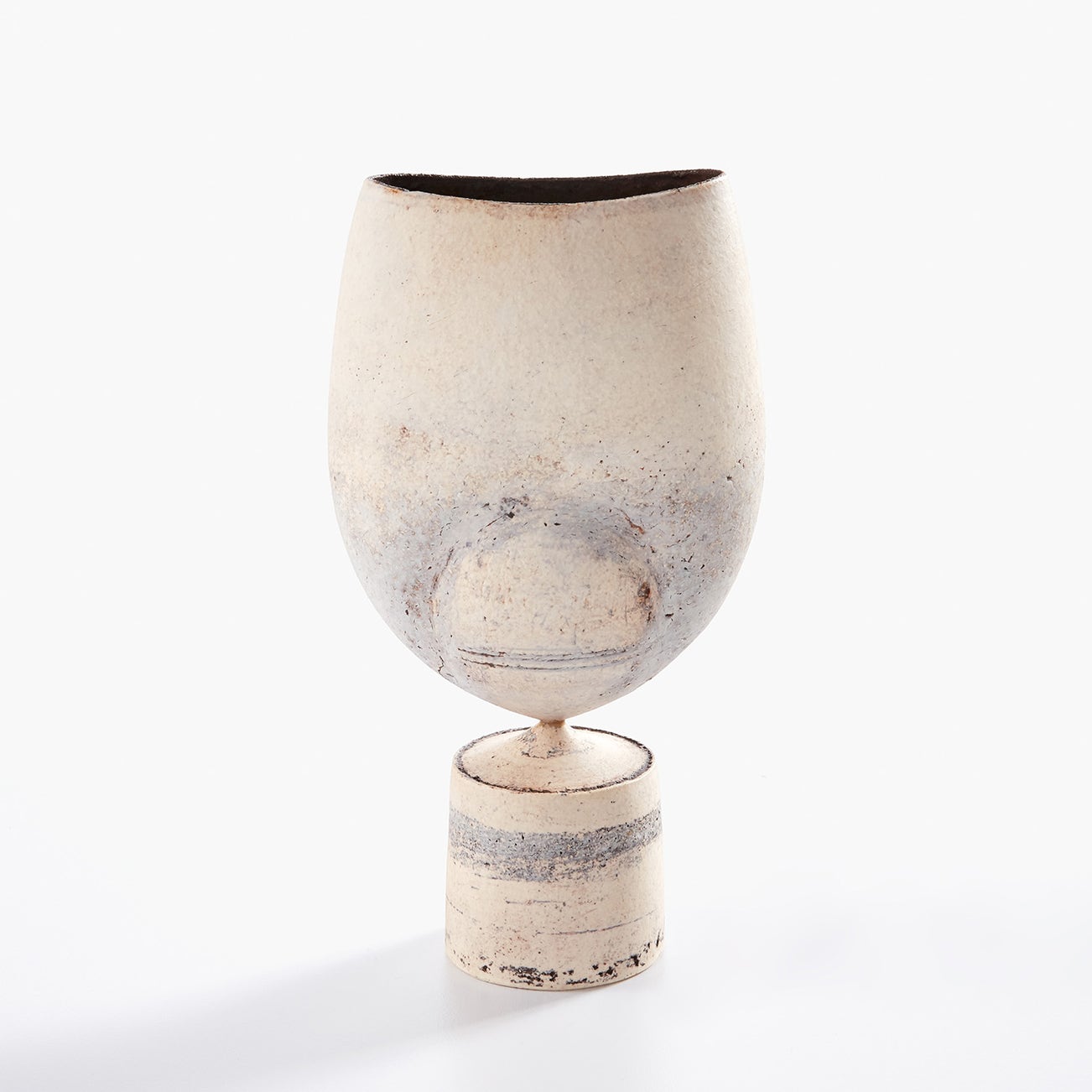 Coper eschewed glazes, preferring the textured surfaces achieved through the application of white and black slips, which evoke the abraded texture of excavated vessels. This interest in ancient objects was very much in step with other modernists of his time—Coper admired Constantin Brancusi and Alberto Giacometti and his textured markings have been compared to sculptors such as William Turnbull. In the last phase of his career, Coper reduced the scale of his work creating works like the present lot, small “Cycladic” pots that stand on pedestals or drums, recalling the clay figures of Bronze Age Greece. Critically renowned, Coper’s work is held in the permanent collections of The Museum of Modern Art, New York; The Metropolitan Museum of Art, New York; and the Victoria & Albert Museum, London, among others.