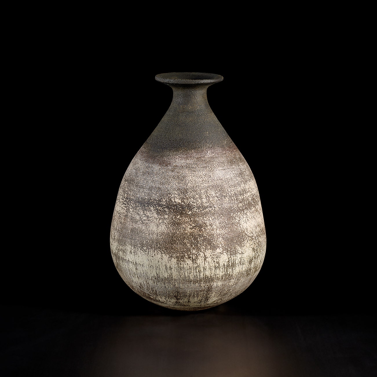 Coper favored compound shapes that, while simple in appearance, were in fact complex in construction. Similar to the making of Joseon Dynasty Moon Jars (Rie in fact displayed a Moon Jar in the studio), he would build his vessels by bringing several thrown forms together, for example joining bowls rim to rim. Coper eschewed glazes and preferred the textured surfaces achieved through the application of white and black slips, evoking the abraded texture of excavated vessels. This interest in ancient objects was very much in step with other modernists of his time—Coper admired Constantin Brancusi and Alberto Giacometti and his textured markings have been compared to sculptors such as William Turnbull.