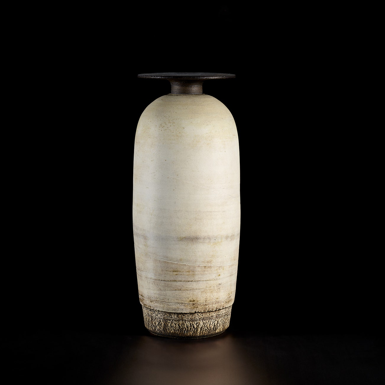 Coper favored compound shapes that, while simple in appearance, were in fact complex in construction. Similar to the making of Joseon Dynasty Moon Jars (Rie in fact displayed a Moon Jar in the studio), he would build his vessels by bringing several thrown forms together, for example joining bowls rim to rim. Coper eschewed glazes and preferred the textured surfaces achieved through the application of white and black slips, evoking the abraded texture of excavated vessels. This interest in ancient objects was very much in step with other modernists of his time—Coper admired Constantin Brancusi and Alberto Giacometti and his textured markings have been compared to sculptors such as William Turnbull.