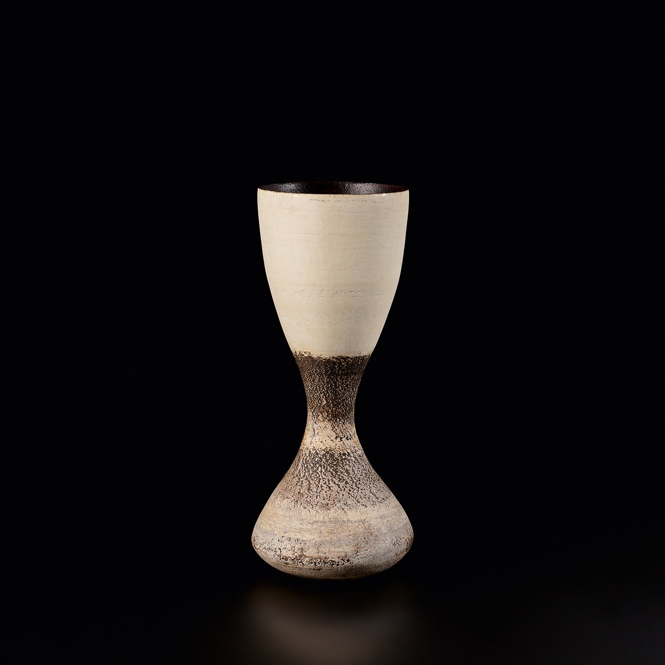 Coper favored compound shapes that, while simple in appearance, were in fact complex in construction. Similar to the making of Joseon Dynasty Moon Jars (Rie in fact displayed a Moon Jar in the studio), he would build his vessels by bringing several thrown forms together, for example joining bowls rim to rim. Coper eschewed glazes and preferred the textured surfaces achieved through the application of white and black slips, evoking the abraded texture of excavated vessels. This interest in ancient objects was very much in step with other modernists of his time—Coper admired Constantin Brancusi and Alberto Giacometti and his textured markings have been compared to sculptors such as William Turnbull.