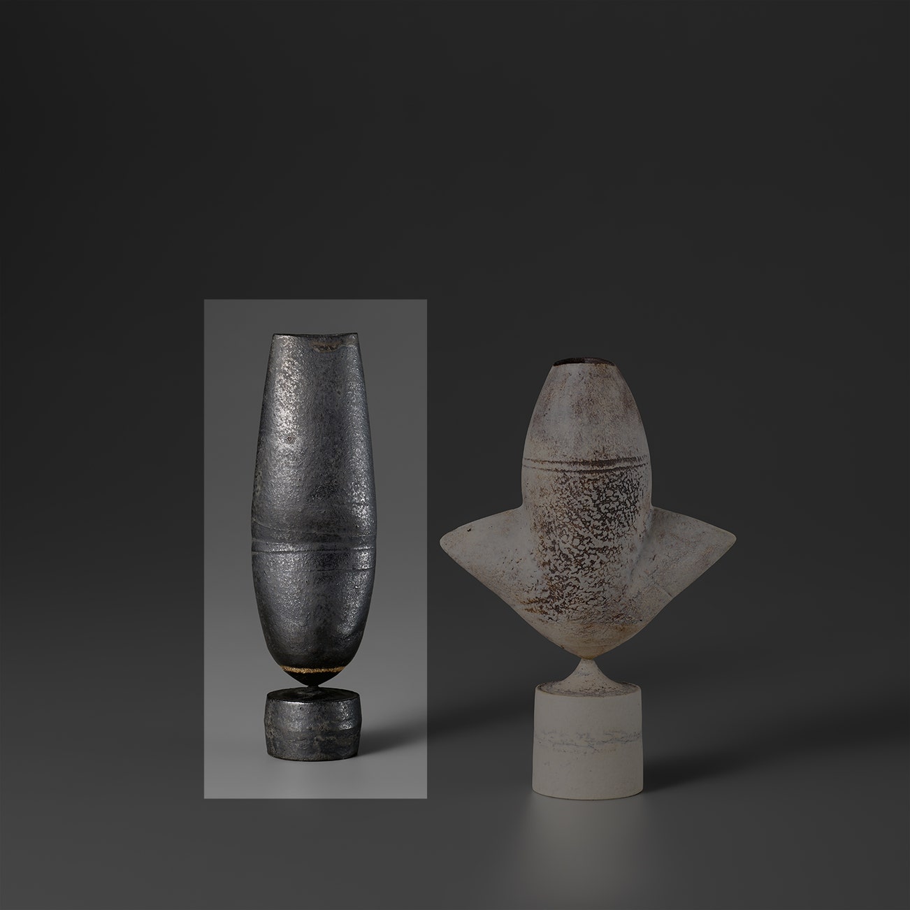 In the last phase of his career, Coper reduced the scale of his work creating small "Cycladic" pots that stood on pedestals or drums, recalling the clay figures of Bronze Age Greece.