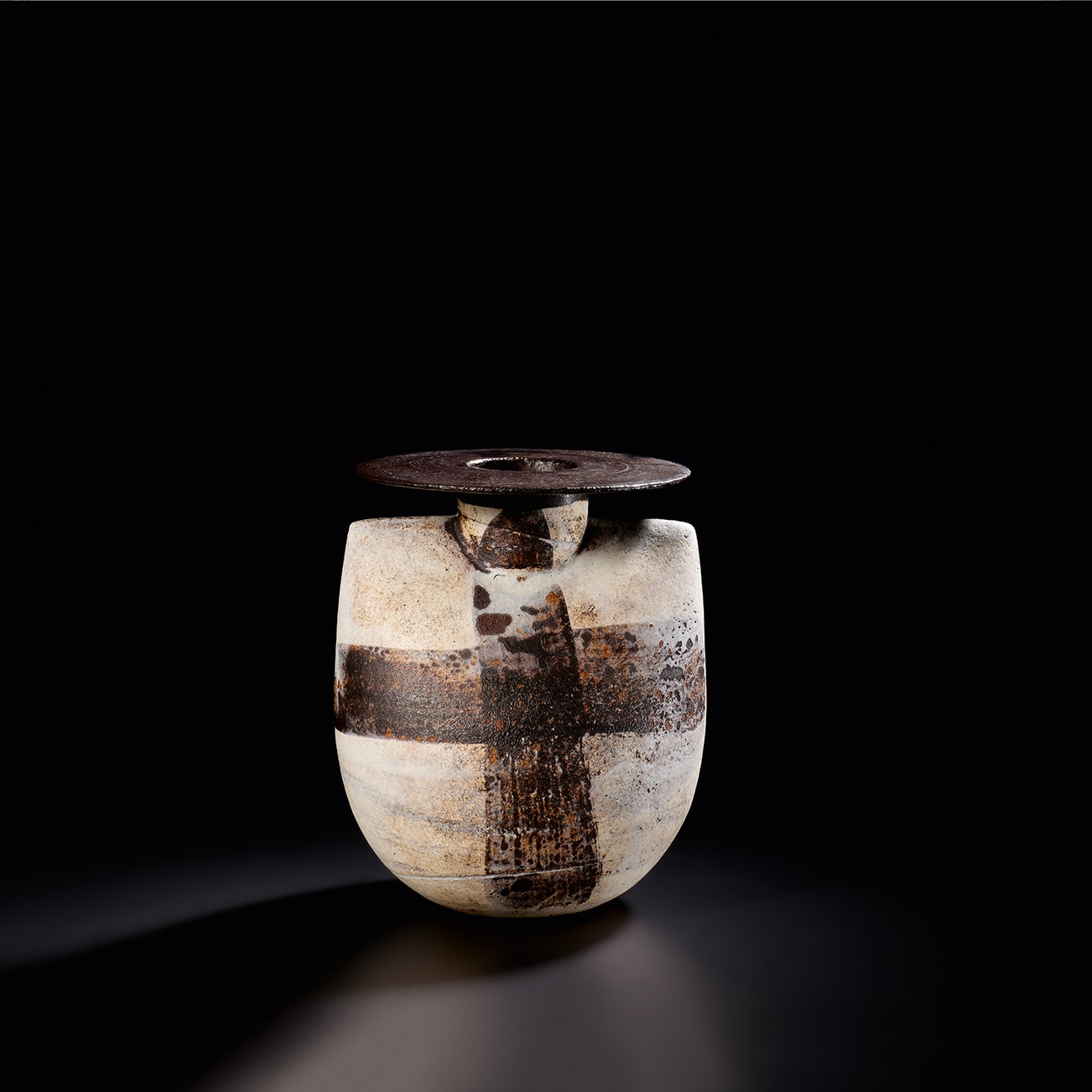In the last phase of his career, Coper reduced the scale of his work creating small "Cycladic" pots that stood on pedestals or drums, recalling the clay figures of Bronze Age Greece.