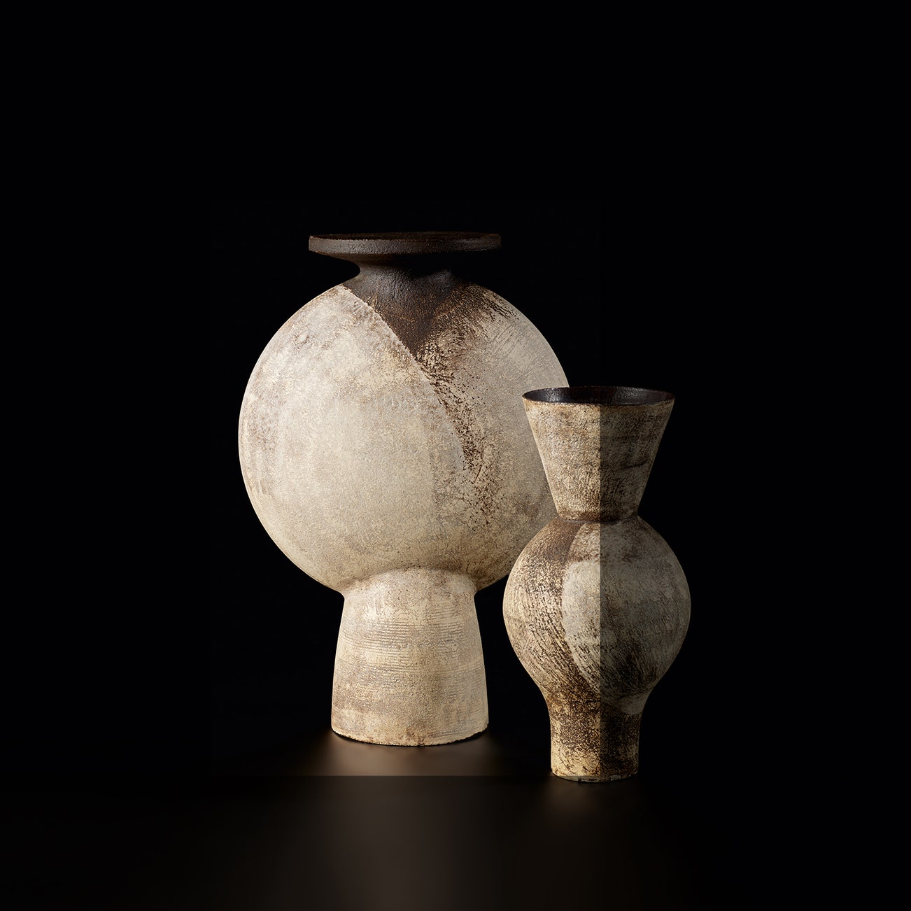 In the last phase of his career, Coper reduced the scale of his work creating small "Cycladic" pots that stood on pedestals or drums, recalling the clay figures of Bronze Age Greece.