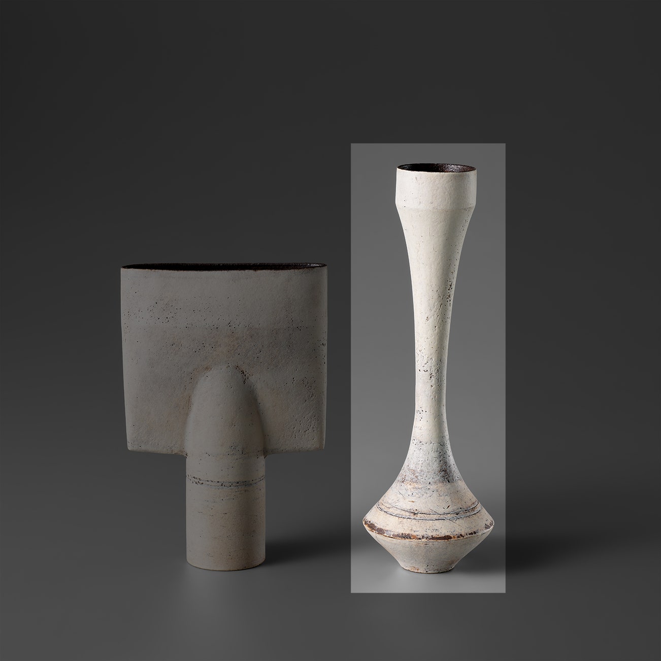Coper favored compound shapes that, while simple in appearance, were in fact complex in construction. Similar to the making of Joseon Dynasty Moon Jars (Rie in fact displayed a Moon Jar in the studio), he would build his vessels by bringing several thrown forms together, for example joining bowls rim to rim. Coper eschewed glazes and preferred the textured surfaces achieved through the application of white and black slips, evoking the abraded texture of excavated vessels. This interest in ancient objects was very much in step with other modernists of his time—Coper admired Constantin Brancusi and Alberto Giacometti and his textured markings have been compared to sculptors such as William Turnbull.