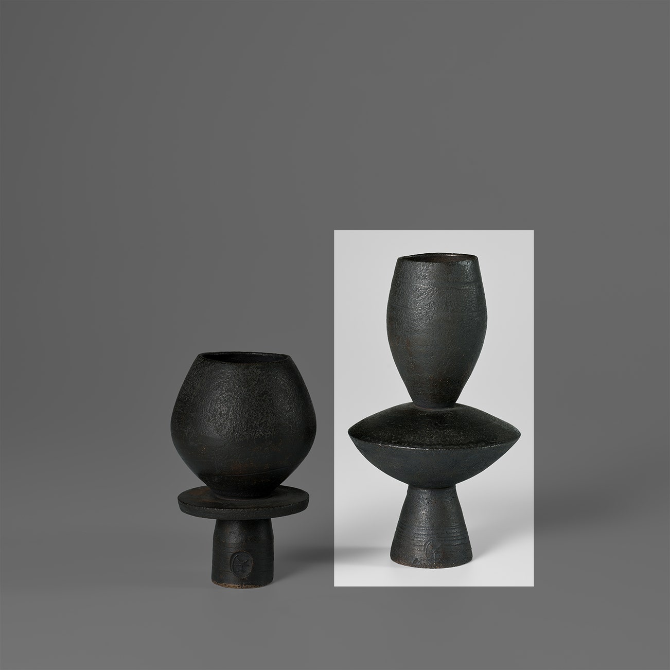 In the last phase of his career, Coper reduced the scale of his work creating small "Cycladic" pots that stood on pedestals or drums, recalling the clay figures of Bronze Age Greece.
