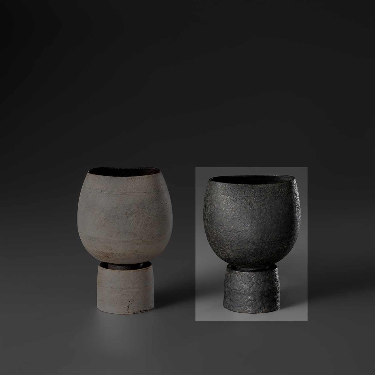 Coper favored compound shapes that, while simple in appearance, were in fact complex in construction. Similar to the making of Joseon Dynasty Moon Jars (Rie in fact displayed a Moon Jar in the studio), he would build his vessels by bringing several thrown forms together, for example joining bowls rim to rim. Coper eschewed glazes and preferred the textured surfaces achieved through the application of white and black slips, evoking the abraded texture of excavated vessels. This interest in ancient objects was very much in step with other modernists of his time—Coper admired Constantin Brancusi and Alberto Giacometti and his textured markings have been compared to sculptors such as William Turnbull.
