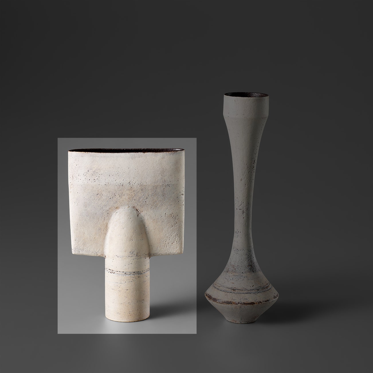 In the last phase of his career, Coper reduced the scale of his work creating small "Cycladic" pots that stood on pedestals or drums, recalling the clay figures of Bronze Age Greece.