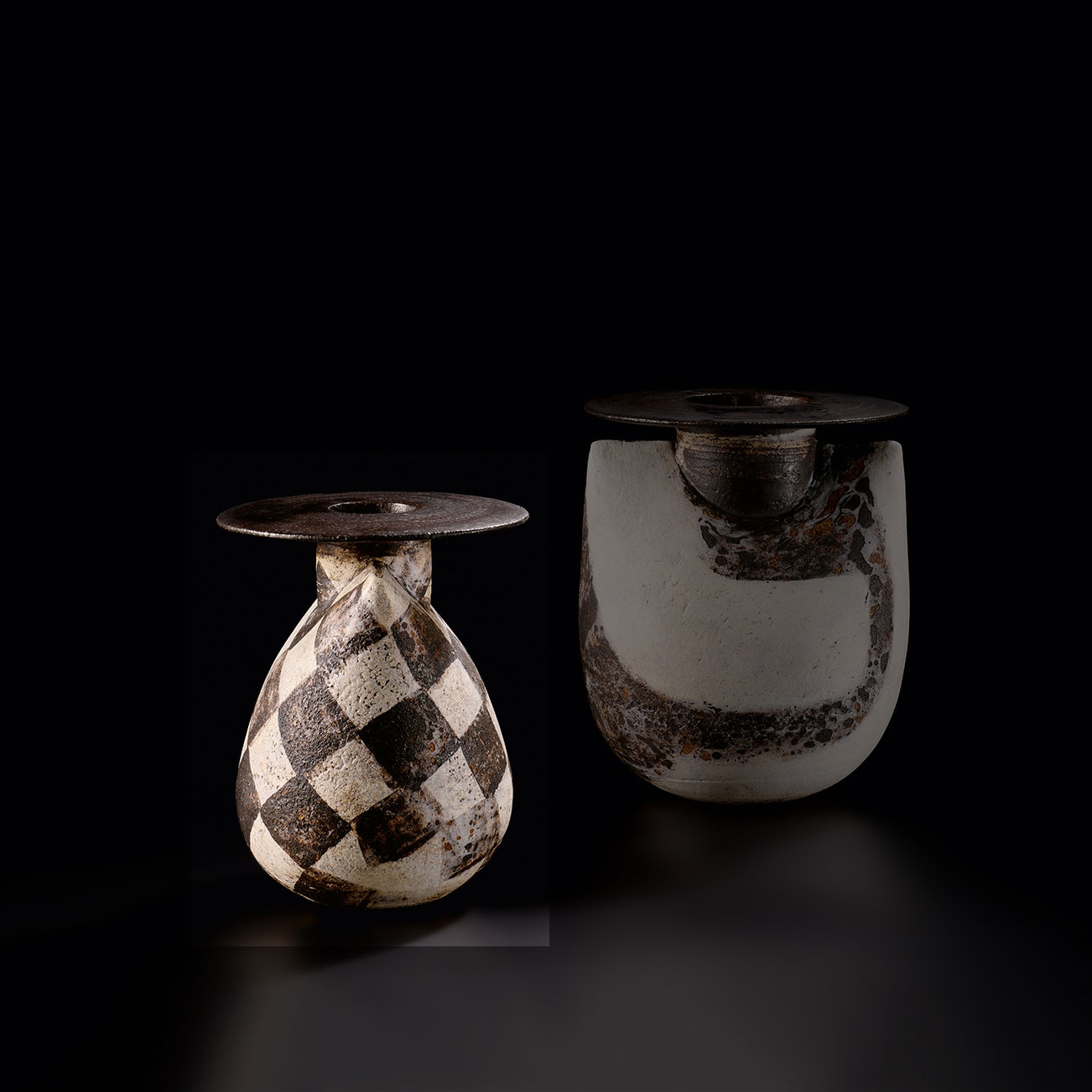 Coper favored compound shapes that, while simple in appearance, were in fact complex in construction. Similar to the making of Joseon Dynasty Moon Jars (Rie in fact displayed a Moon Jar in the studio), he would build his vessels by bringing several thrown forms together, for example joining bowls rim to rim. Coper eschewed glazes and preferred the textured surfaces achieved through the application of white and black slips, evoking the abraded texture of excavated vessels. This interest in ancient objects was very much in step with other modernists of his time—Coper admired Constantin Brancusi and Alberto Giacometti and his textured markings have been compared to sculptors such as William Turnbull.