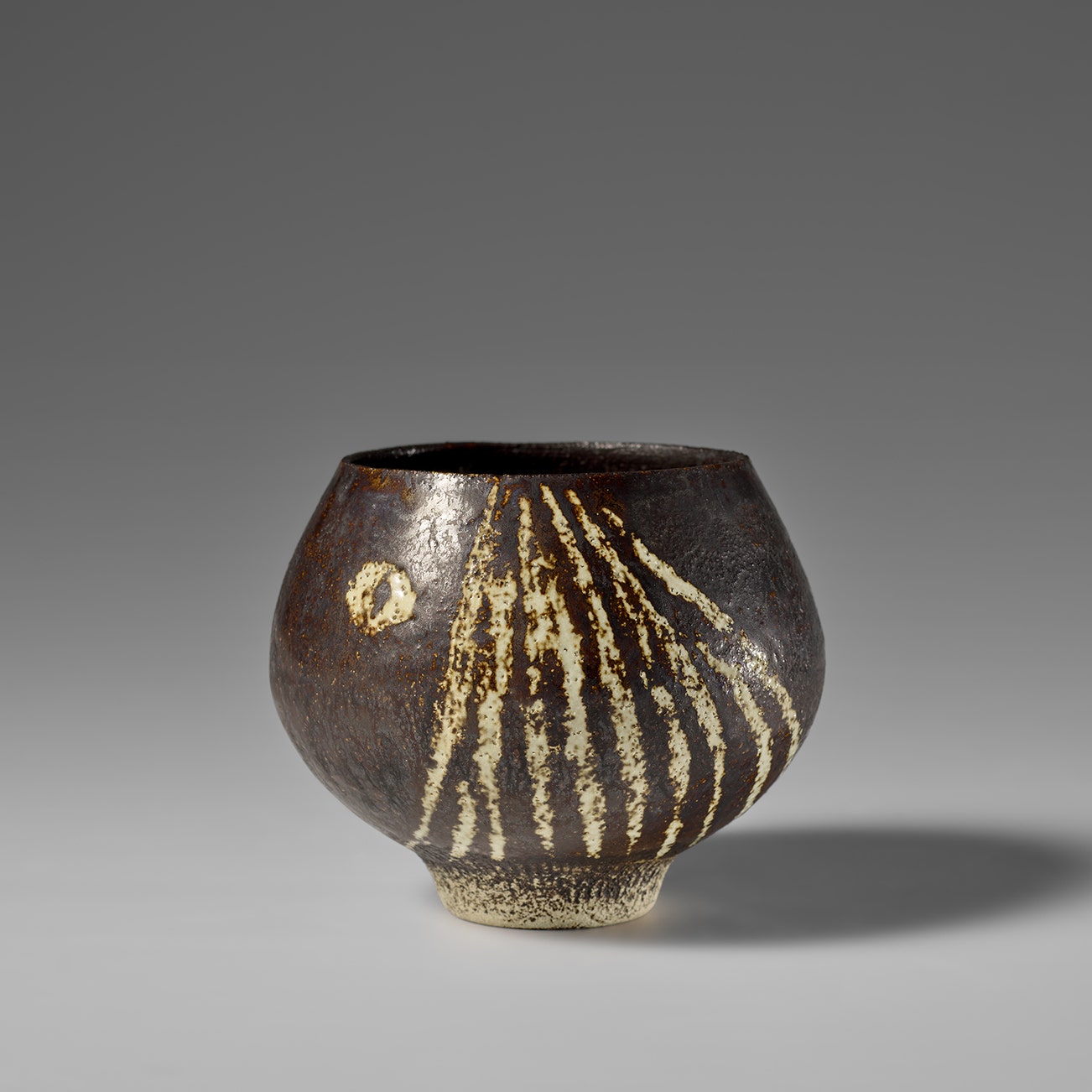 Coper favored compound shapes that, while simple in appearance, were in fact complex in construction. Similar to the making of Joseon Dynasty Moon Jars (Rie in fact displayed a Moon Jar in the studio), he would build his vessels by bringing several thrown forms together, for example joining bowls rim to rim. Coper eschewed glazes and preferred the textured surfaces achieved through the application of white and black slips, evoking the abraded texture of excavated vessels. This interest in ancient objects was very much in step with other modernists of his time—Coper admired Constantin Brancusi and Alberto Giacometti and his textured markings have been compared to sculptors such as William Turnbull.