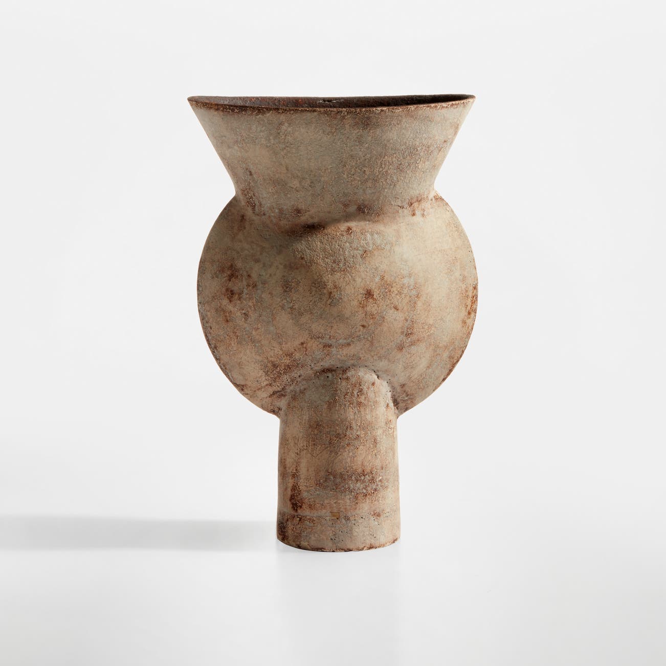 In the last phase of his career, Coper reduced the scale of his work creating small "Cycladic" pots that stood on pedestals or drums, recalling the clay figures of Bronze Age Greece.