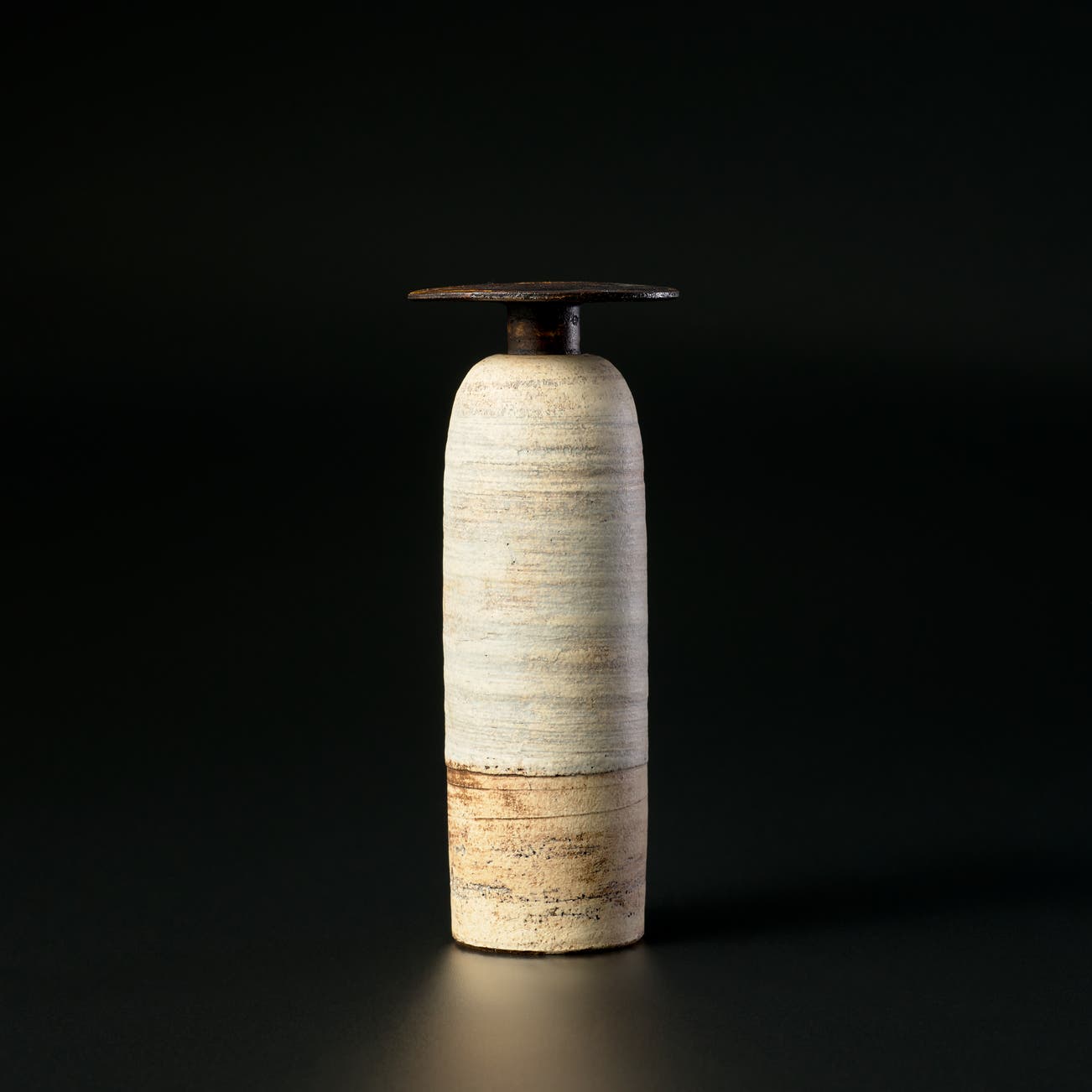 In the last phase of his career, Coper reduced the scale of his work creating small "Cycladic" pots that stood on pedestals or drums, recalling the clay figures of Bronze Age Greece.