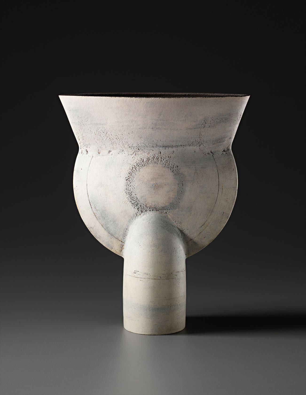 Coper favored compound shapes that, while simple in appearance, were in fact complex in construction. Similar to the making of Joseon Dynasty Moon Jars (Rie in fact displayed a Moon Jar in the studio), he would build his vessels by bringing several thrown forms together, for example joining bowls rim to rim. Coper eschewed glazes and preferred the textured surfaces achieved through the application of white and black slips, evoking the abraded texture of excavated vessels. This interest in ancient objects was very much in step with other modernists of his time—Coper admired Constantin Brancusi and Alberto Giacometti and his textured markings have been compared to sculptors such as William Turnbull.