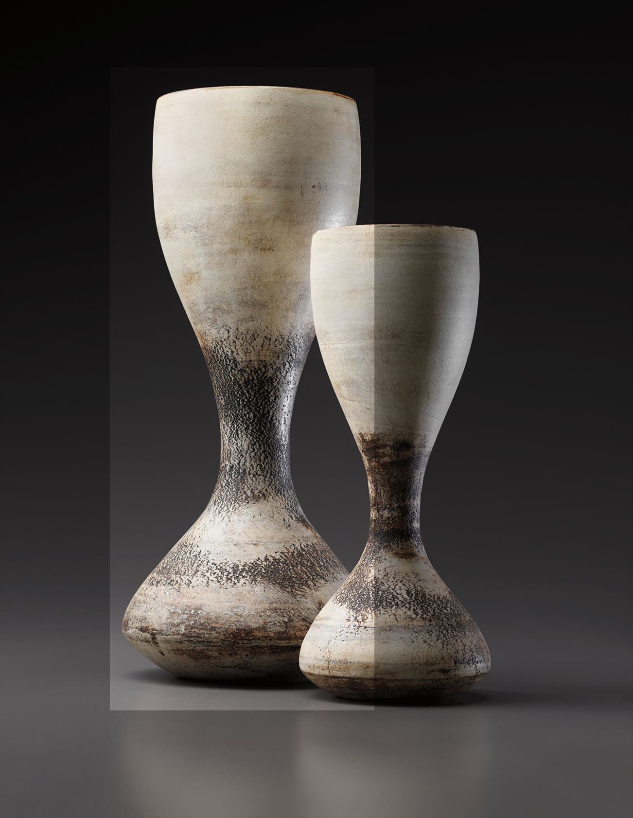 Coper favored compound shapes that, while simple in appearance, were in fact complex in construction. Similar to the making of Joseon Dynasty Moon Jars (Rie in fact displayed a Moon Jar in the studio), he would build his vessels by bringing several thrown forms together, for example joining bowls rim to rim. Coper eschewed glazes and preferred the textured surfaces achieved through the application of white and black slips, evoking the abraded texture of excavated vessels. This interest in ancient objects was very much in step with other modernists of his time—Coper admired Constantin Brancusi and Alberto Giacometti and his textured markings have been compared to sculptors such as William Turnbull.