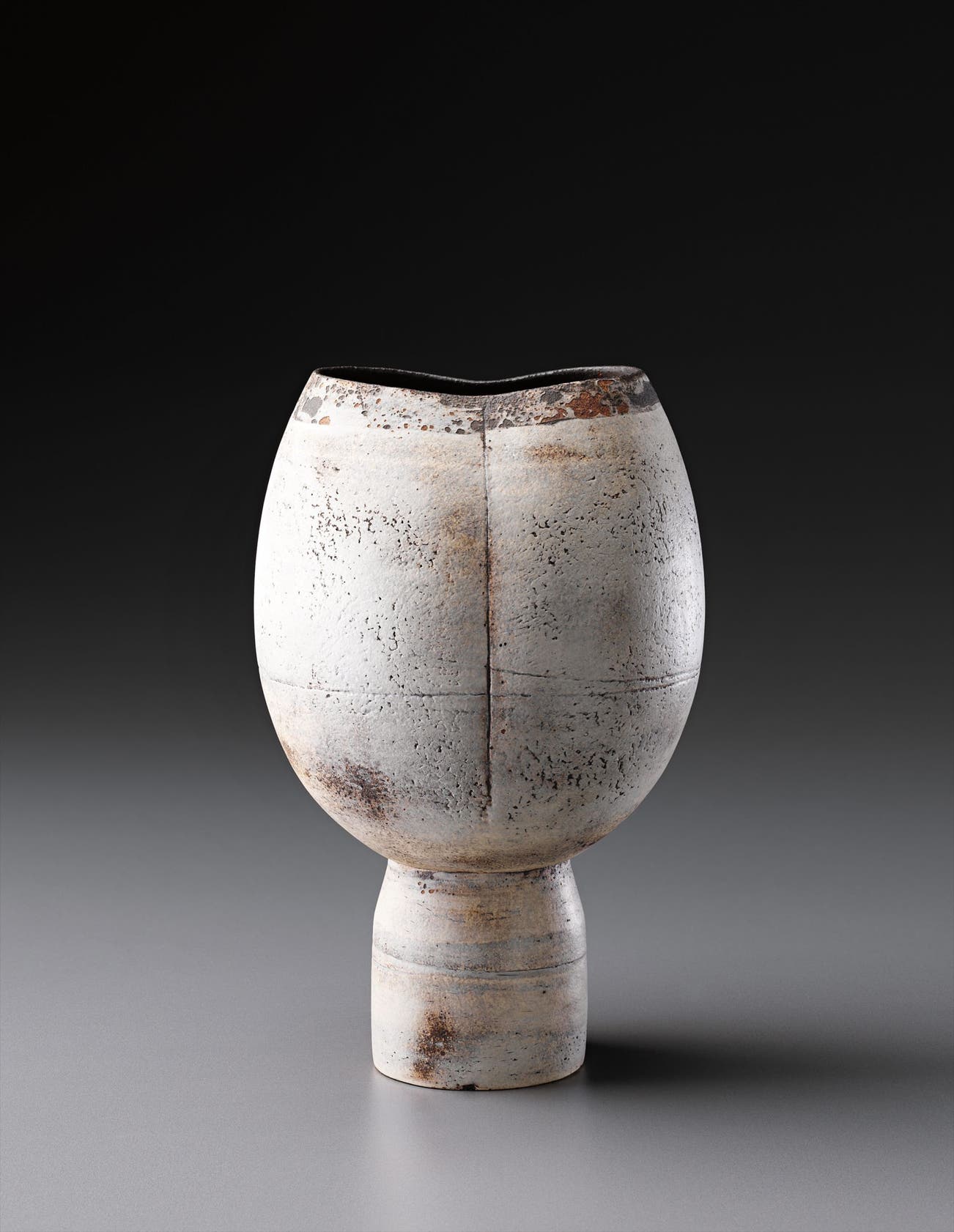 Coper favored compound shapes that, while simple in appearance, were in fact complex in construction. Similar to the making of Joseon Dynasty Moon Jars (Rie in fact displayed a Moon Jar in the studio), he would build his vessels by bringing several thrown forms together, for example joining bowls rim to rim. Coper eschewed glazes and preferred the textured surfaces achieved through the application of white and black slips, evoking the abraded texture of excavated vessels. This interest in ancient objects was very much in step with other modernists of his time—Coper admired Constantin Brancusi and Alberto Giacometti and his textured markings have been compared to sculptors such as William Turnbull.