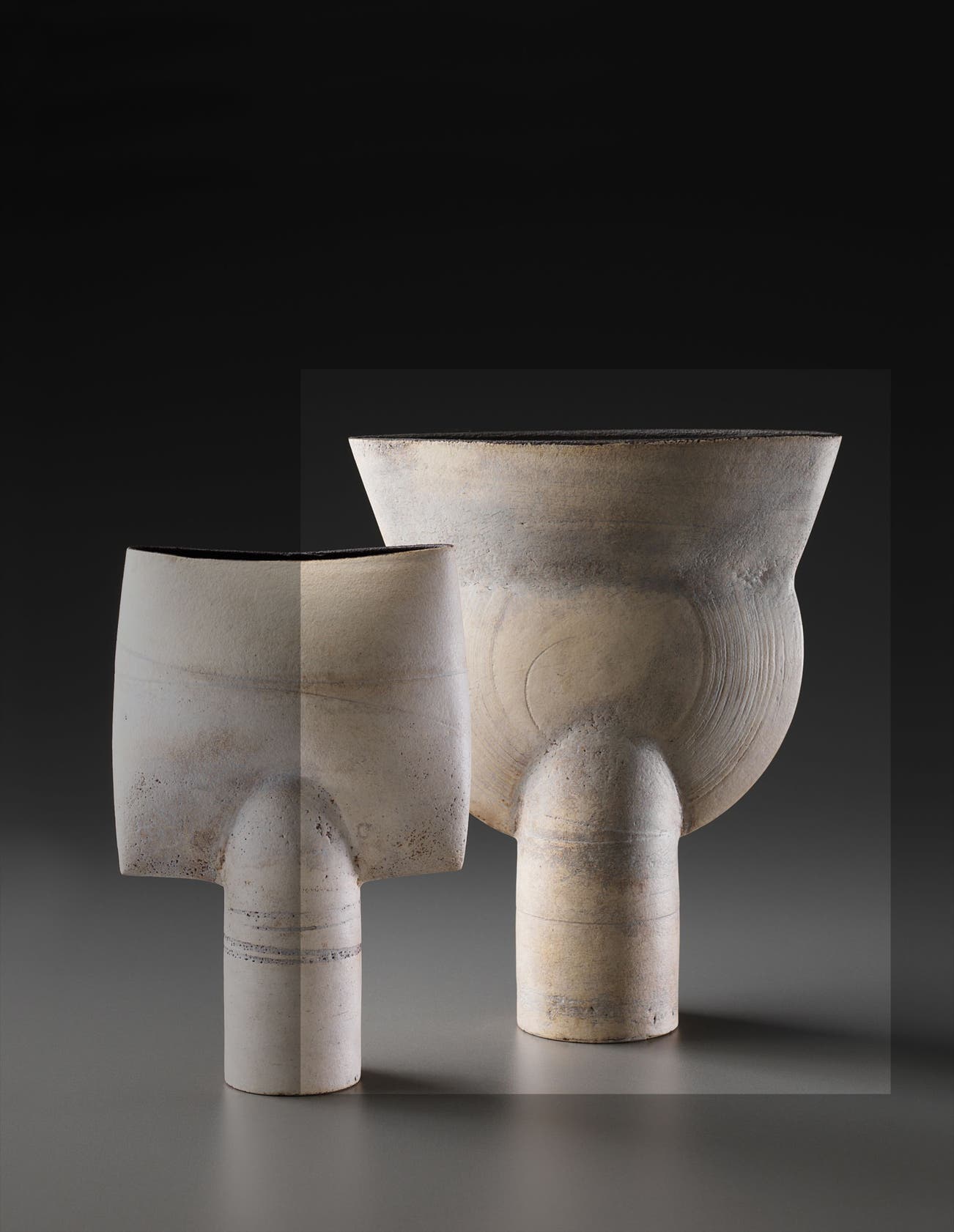 In the last phase of his career, Coper reduced the scale of his work creating small "Cycladic" pots that stood on pedestals or drums, recalling the clay figures of Bronze Age Greece.