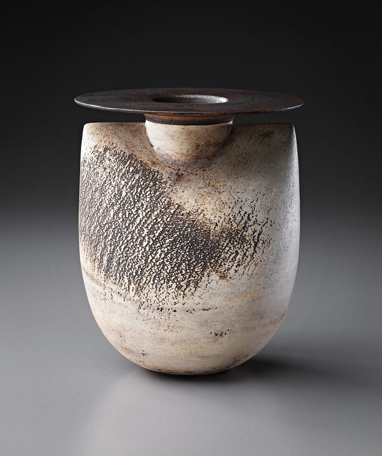 Coper favored compound shapes that, while simple in appearance, were in fact complex in construction. Similar to the making of Joseon Dynasty Moon Jars (Rie in fact displayed a Moon Jar in the studio), he would build his vessels by bringing several thrown forms together, for example joining bowls rim to rim. Coper eschewed glazes and preferred the textured surfaces achieved through the application of white and black slips, evoking the abraded texture of excavated vessels. This interest in ancient objects was very much in step with other modernists of his time—Coper admired Constantin Brancusi and Alberto Giacometti and his textured markings have been compared to sculptors such as William Turnbull.