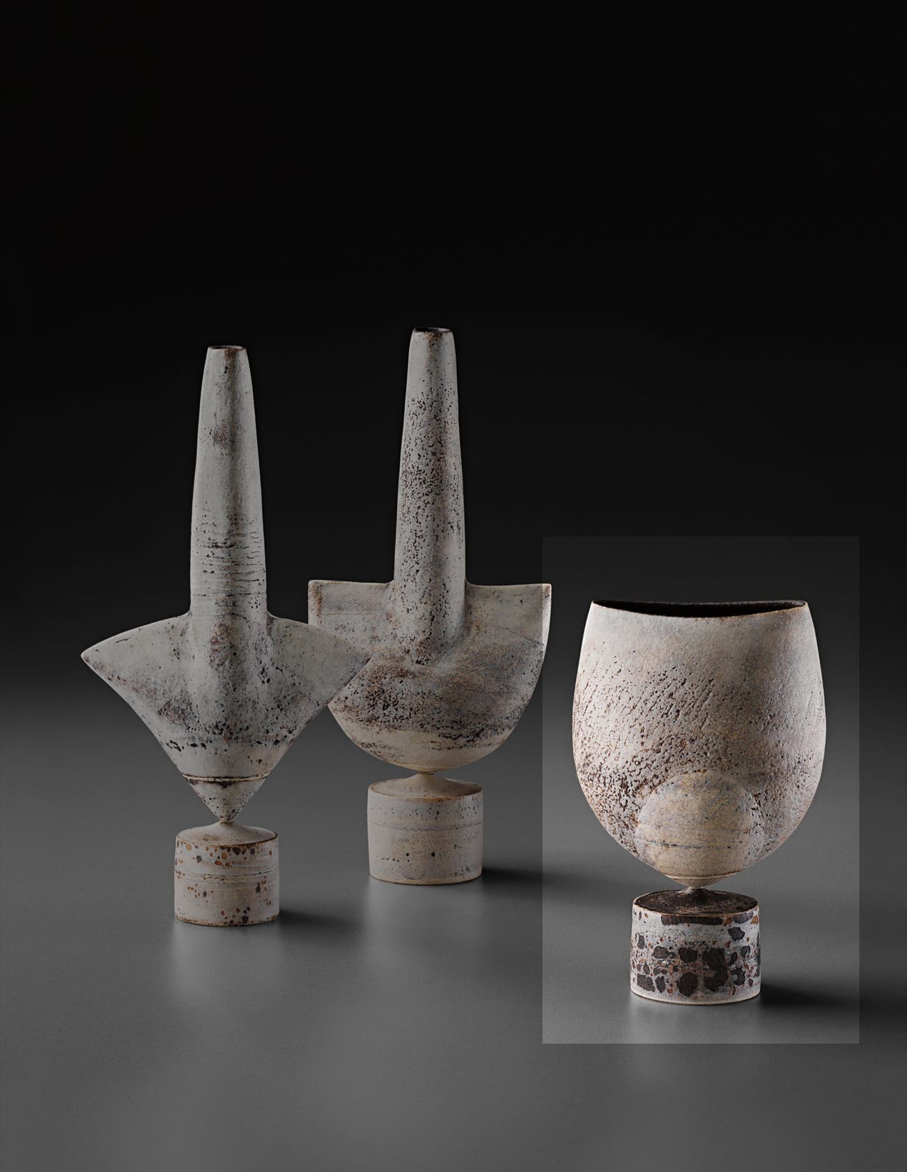 In the last phase of his career, Coper reduced the scale of his work creating small "Cycladic" pots that stood on pedestals or drums, recalling the clay figures of Bronze Age Greece.