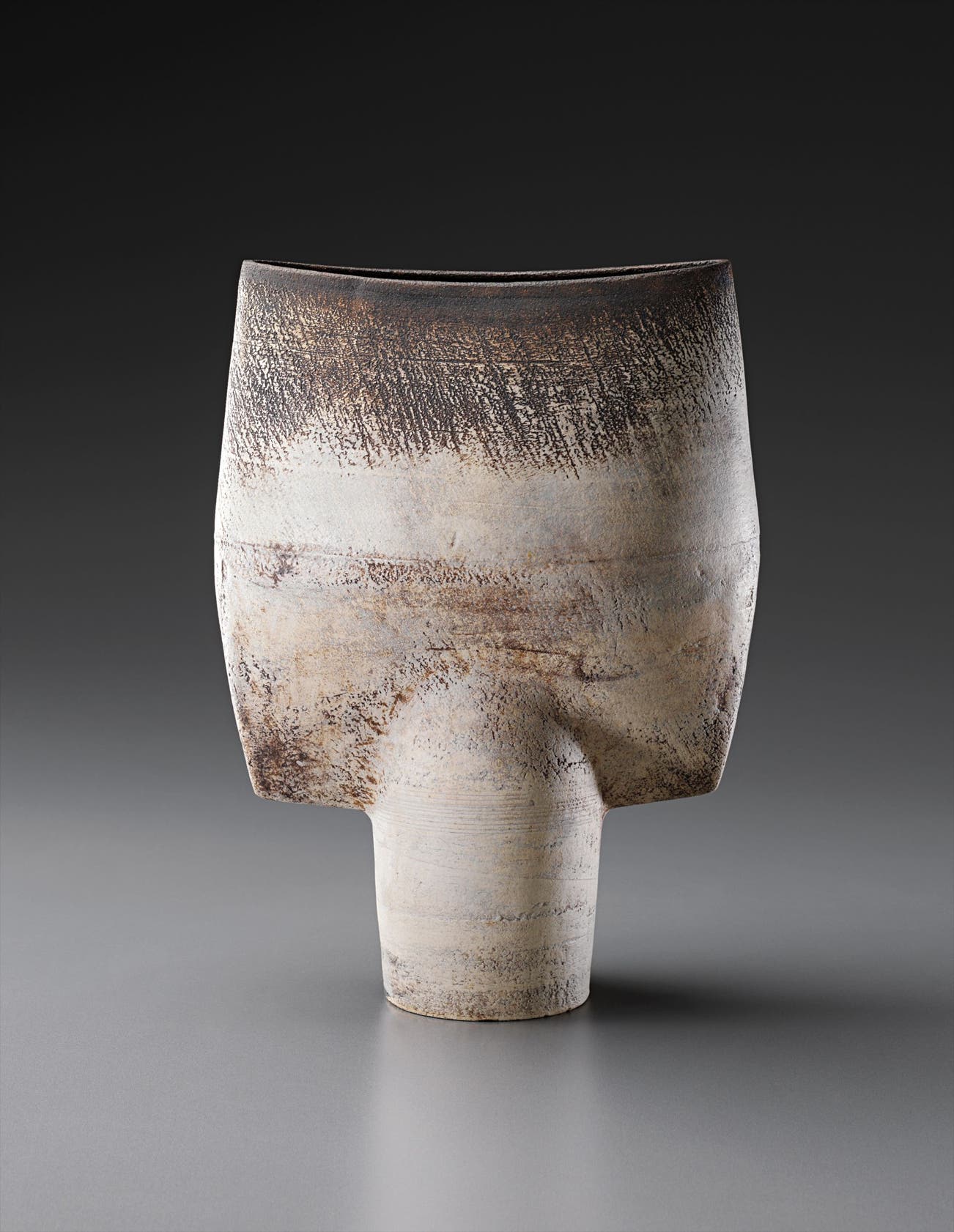 In the last phase of his career, Coper reduced the scale of his work creating small "Cycladic" pots that stood on pedestals or drums, recalling the clay figures of Bronze Age Greece.