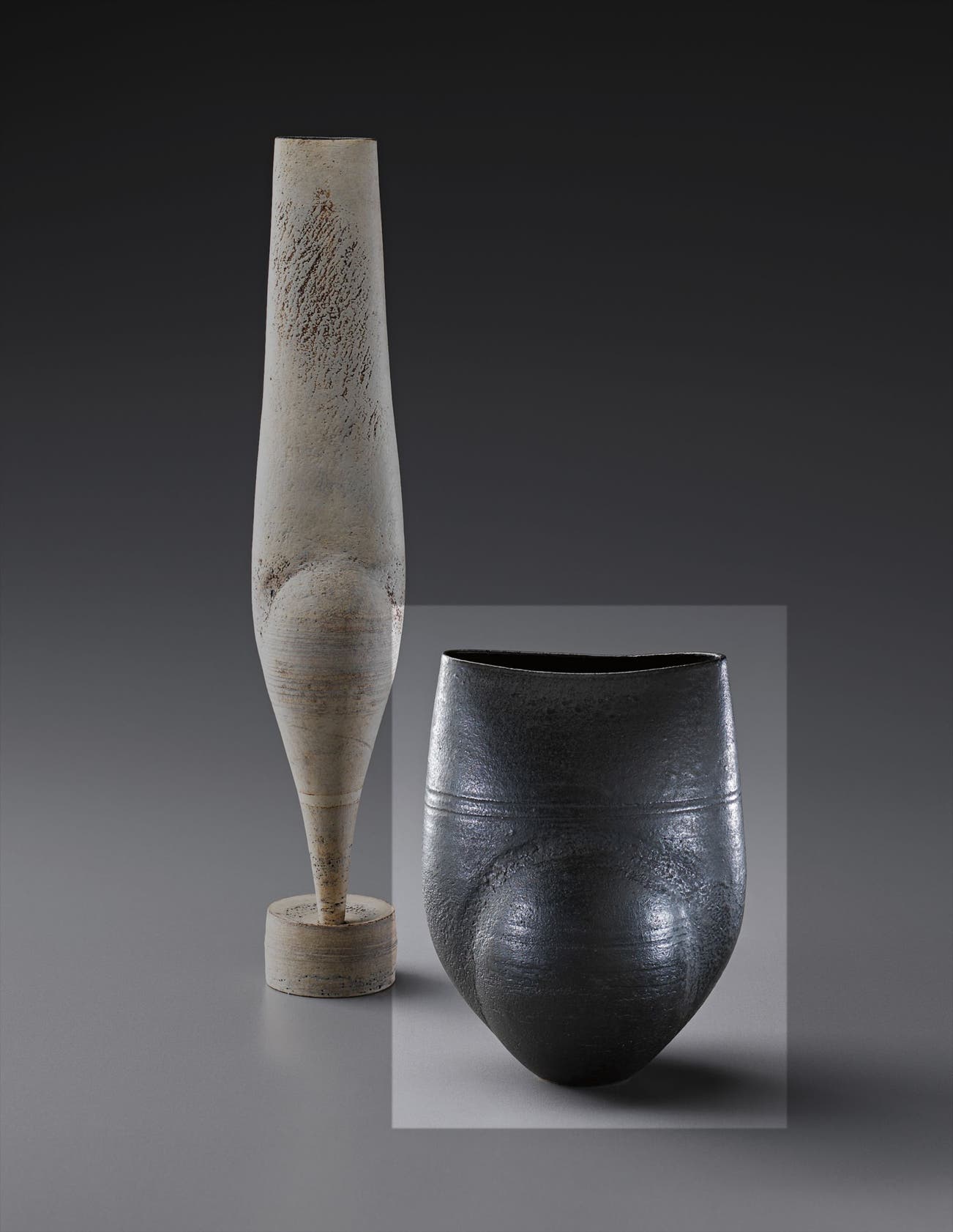 Coper favored compound shapes that, while simple in appearance, were in fact complex in construction. Similar to the making of Joseon Dynasty Moon Jars (Rie in fact displayed a Moon Jar in the studio), he would build his vessels by bringing several thrown forms together, for example joining bowls rim to rim. Coper eschewed glazes and preferred the textured surfaces achieved through the application of white and black slips, evoking the abraded texture of excavated vessels. This interest in ancient objects was very much in step with other modernists of his time—Coper admired Constantin Brancusi and Alberto Giacometti and his textured markings have been compared to sculptors such as William Turnbull.