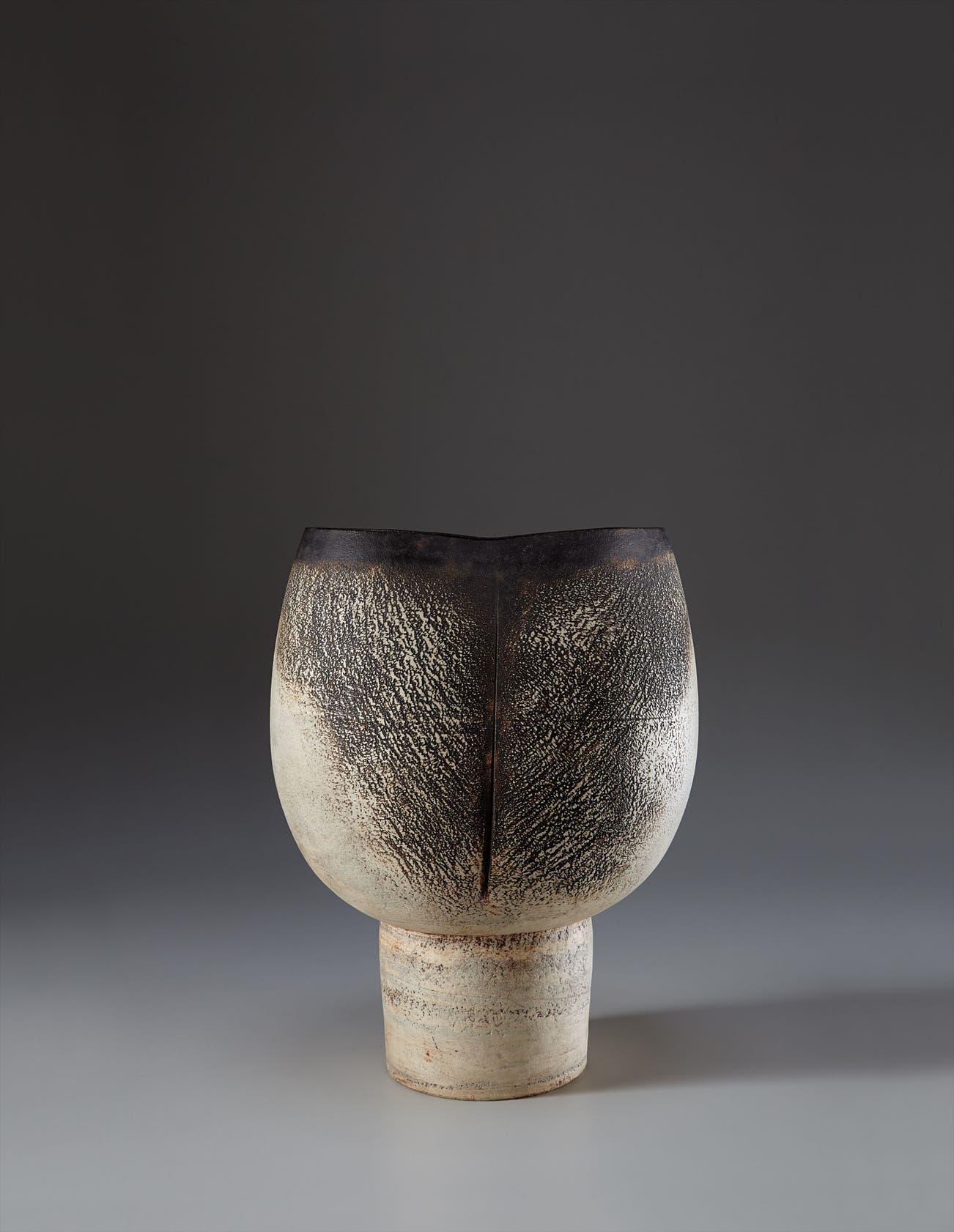 Coper favored compound shapes that, while simple in appearance, were in fact complex in construction. Similar to the making of Joseon Dynasty Moon Jars (Rie in fact displayed a Moon Jar in the studio), he would build his vessels by bringing several thrown forms together, for example joining bowls rim to rim. Coper eschewed glazes and preferred the textured surfaces achieved through the application of white and black slips, evoking the abraded texture of excavated vessels. This interest in ancient objects was very much in step with other modernists of his time—Coper admired Constantin Brancusi and Alberto Giacometti and his textured markings have been compared to sculptors such as William Turnbull.