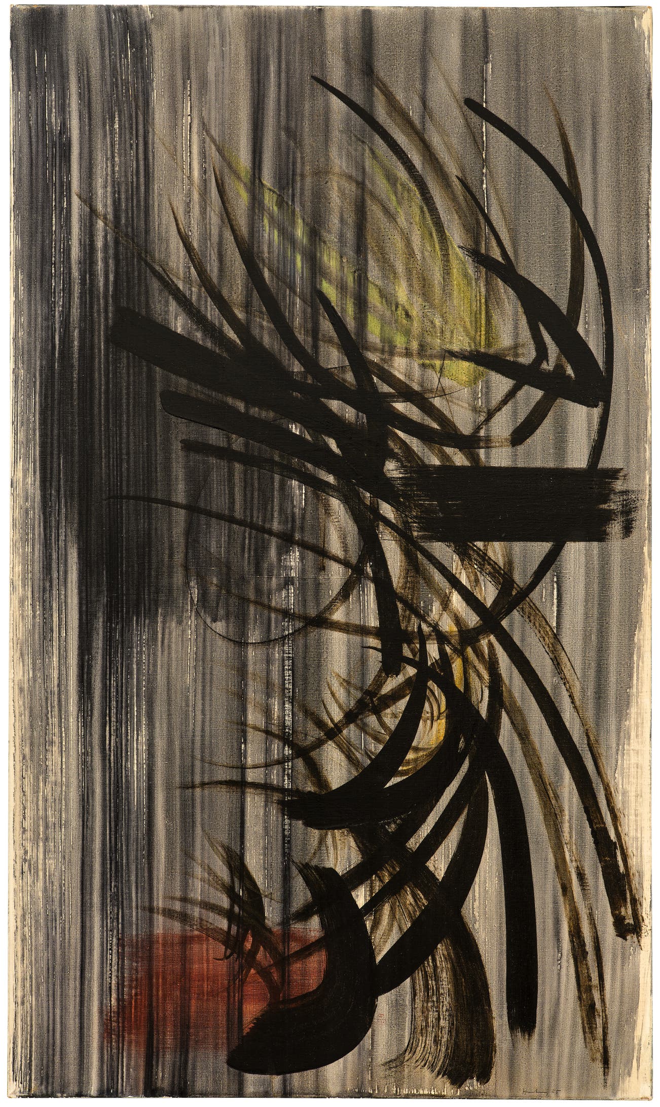 signed and dated 'Hartung 55' lower right; titled and inscribed 'T1955-28 Landau' on the stretcher