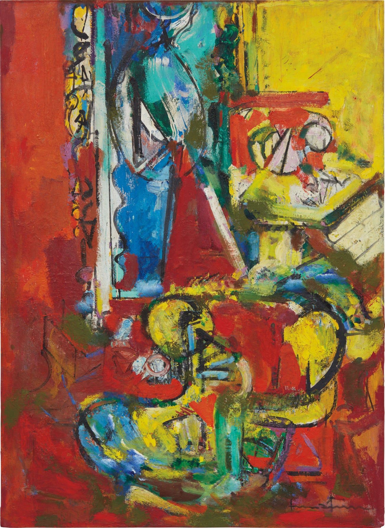 Hofmann’s mature practice and personal exploration into abstraction were heavily influenced by his encounters with de Kooning and Pollock, and informed by European masters like Matisse and Picasso. In Wicker Chair No. II, exuberant Fauve colors coalesce with fractured planes and angles, inspired by the artist’s early exposure to Cubism. In all of his works, Hofmann stressed the importance of working from life as a starting point, regardless of what level of abstraction the final composition might take. Here, the viewer is just able to discern a table-top still life in the upper right quadrant, and a yellow wicker chair in the lower center, for which the painting is titled. Moreover, what initially appears as a blue abstraction in the upper portion of the composition is in fact a painting by Joan Miró, Image, 1937, which was in the artist’s personal collection. Hofmann achieved this level of abstraction through overlaying lines and angles, and ultimately developed his own artistic theory which he termed “push and pull”, to describe the co-existence of flatness and depth on canvas, as evidenced in the present lot.