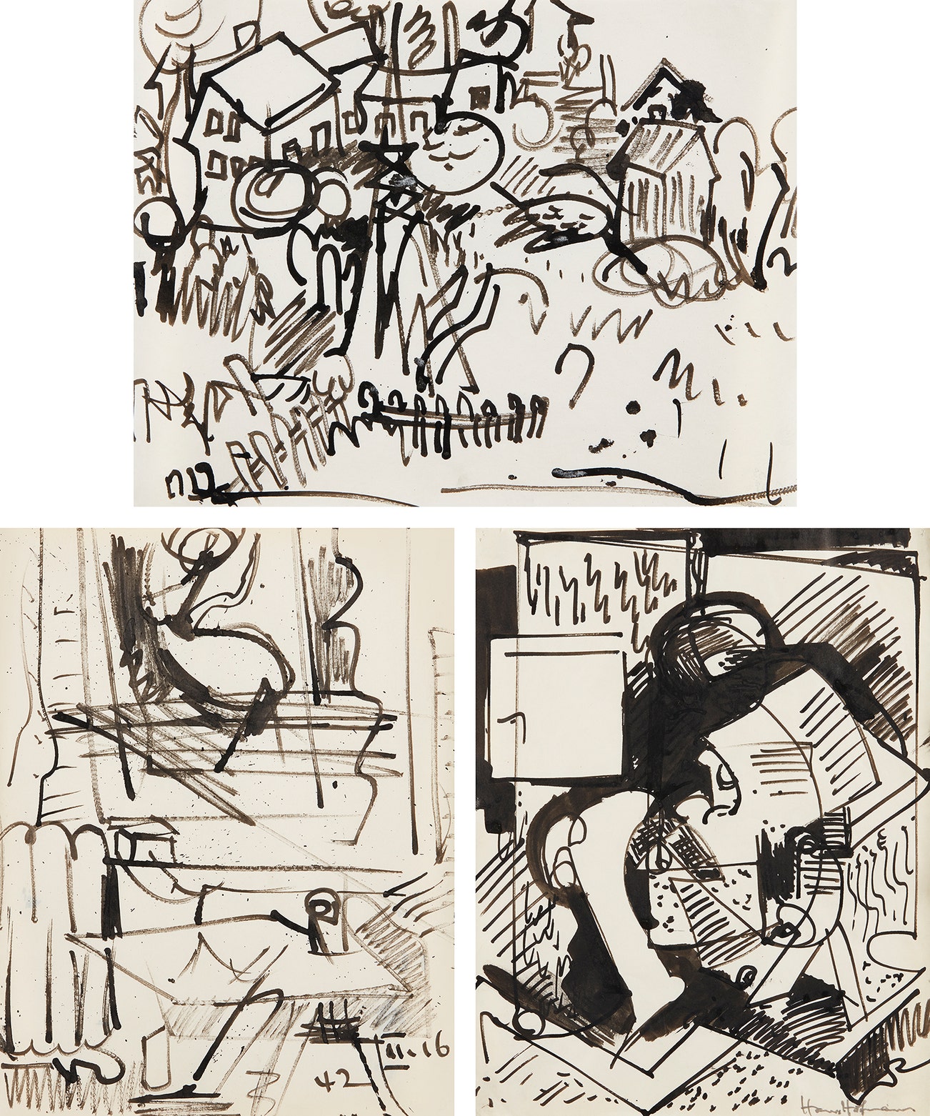 One drawing signed in grey ink and one dated in black ink, all stamped with the Estate of Hans Hofmann stamp and registration numbers in ink on the respective backing boards, all framed.