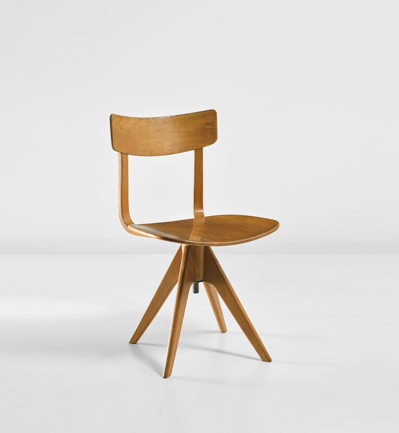 The present swivel chair designed by Hans J. Wegner in 1941 dates from the designer’s early career in Aarhus, where he established his first architecture studio in 1943. Between 1936 and 1938, Wegner studied at the Cabinetmaker Day School at the School of Arts and Crafts, Copenhagen. In 1938 he was offered a position in the architecture office of Arne Jacobsen and Erik Møller, who had recently won the commission to design the new Aarhus City Hall. Jacobsen and Møller entrusted the young Wegner to design the building’s furniture. Wegner’s furniture designs for the city hall’s main building were handcrafted, while his designs for the two office wings were manufactured by the Aarhus based firm Plan Møbler. Impressed by his work, Plan Møbler hired Wegner to design three series of modular office furniture. The present chair, featured only in Plan Møbler’s first catalogue and thought to have been produced in very limited numbers, was developed from Wegner’s designs for Aarhus City Hall, but now constructed entirely in wood. Wegner’s first project for the city hall had been to create a wooden model of the building. For his materials, Wegner had contacted the cabinetmaker and expert wood carver, Mikael Laursen, who he had first met in Tønder, where as a teenager Wegner carved wood sculpture. From 1940 to 1949, Wegner collaborated with Laursen, who was then the head of production of Plan Møbler, and it is possible the present chair was executed by Laursen.